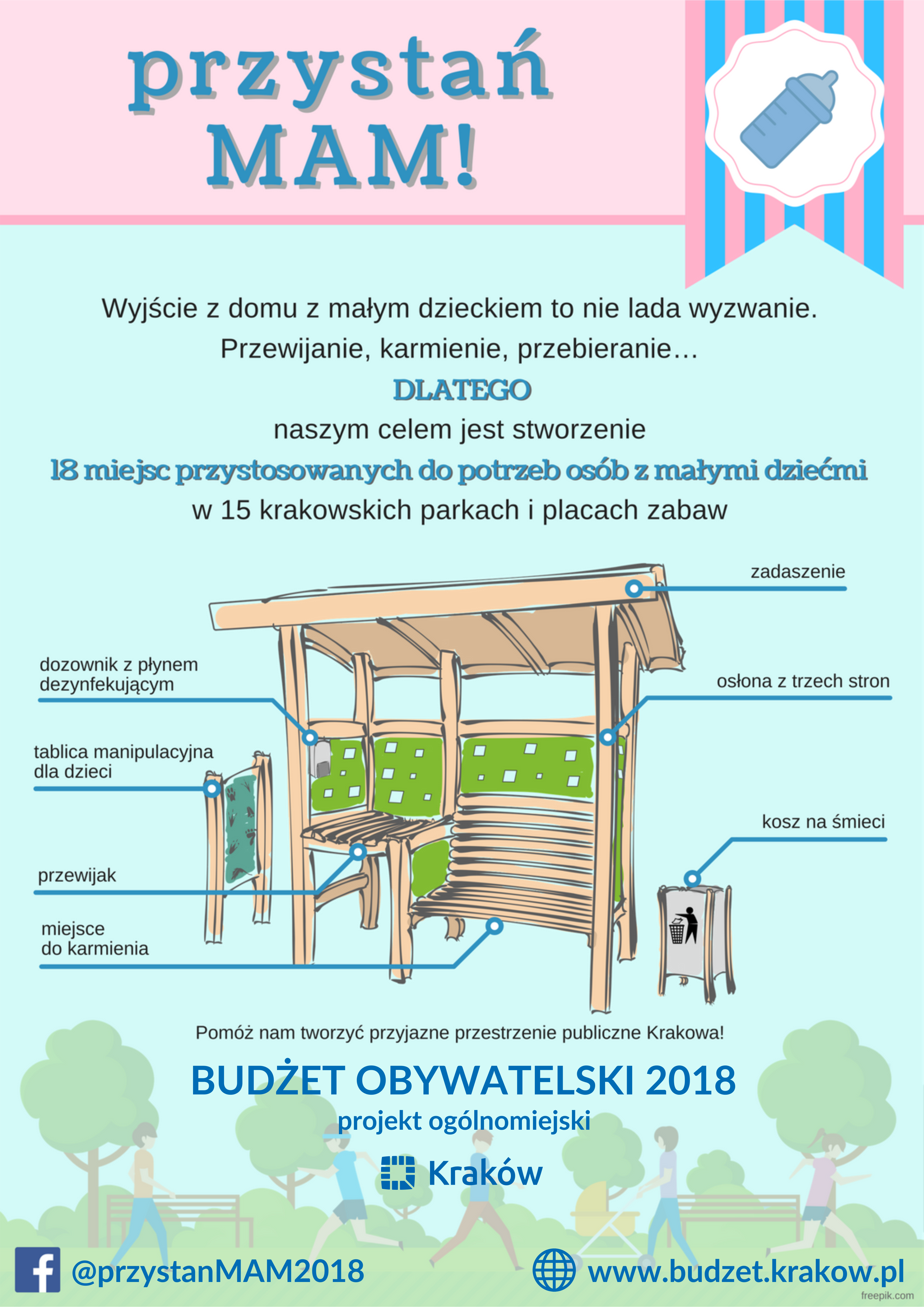 W ramach projektu proponuje się przygotowanie zadaszonych i osłoniętych z trzech stron ławek w przestrzeniach publicznych Miasta Krakowa, wyposażonych w przewijak i tablicę manipulacyjną dla starszych dzieci. Instalacje te umożliwiają swobodne i komfortowe nakarmienie dziecka i wykonanie czynności higienicznych w parkach miejskich i na placach zabaw. Zadaszenie i osłonięcie ochronią ławkę i osoby korzystające z niej od niekorzystnych warunków atmosferycznych oraz zapewnią poczucie bezpieczeństwa i prywatności. Ławka i przewijak pozwolą m.in. na komfortowe nakarmienie i przewinięcie dziecka. Tablica manipulacyjna będzie służyć zapewnieniu zajęcia starszym dzieciom, podczas gdy opiekunowie korzystają z ławki. Ponadto, projekt zakłada umieszczenie tablic informacyjnych małych tablic z regulaminem użytkowania instalacji, które przedstawią informacje dotyczące użytkowania zgodnego z przeznaczeniem produktów.