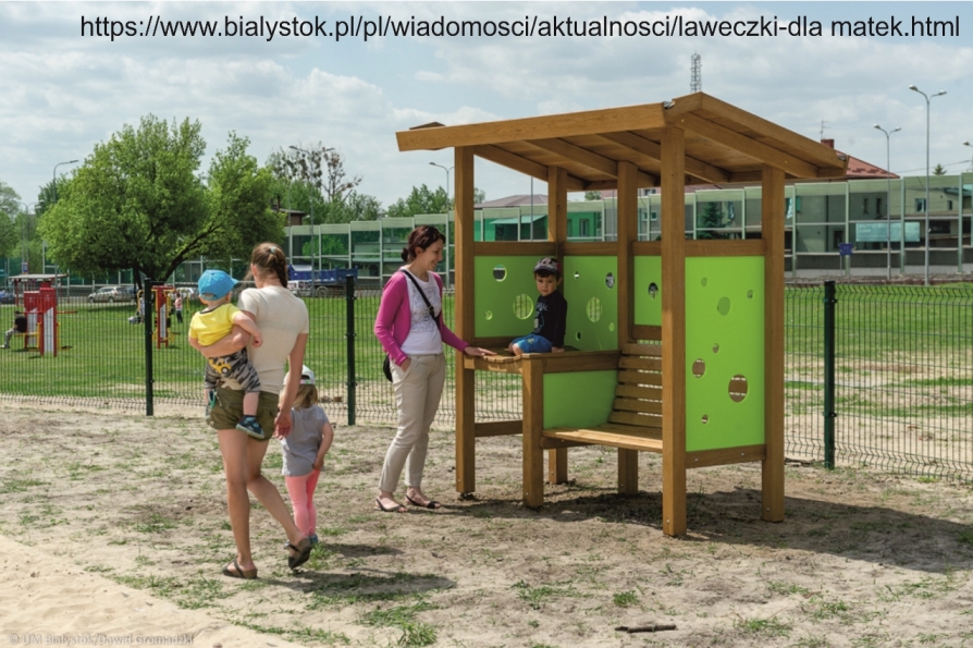 Utworzenie zadaszonych i osłoniętych ławek umożliwiających karmienie, wyposażonych w przewijak i tablicę manipulacyjną dla starszych dzieci oraz tablic informacyjnych w parkach i placach zabaw.