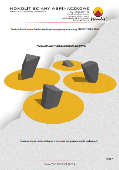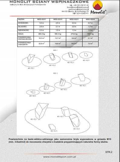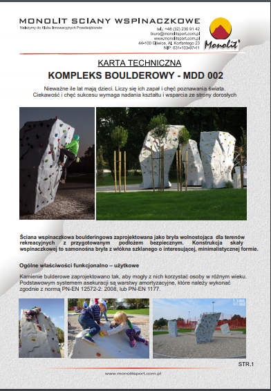Zakup i montaż ścianki wspinaczkowej zaprojektowanej jako bryła wolnostojąca dla terenów rekreacyjnych ze specjalnym bezpiecznym podłożem. Ściana wspinaczkowa o wymiarach: wysokość 3 m, długość 2,6 m, szerokość 2 m. Przykładowo taka jak: Model MDD002/1 z załączonej karty technicznej produktu.