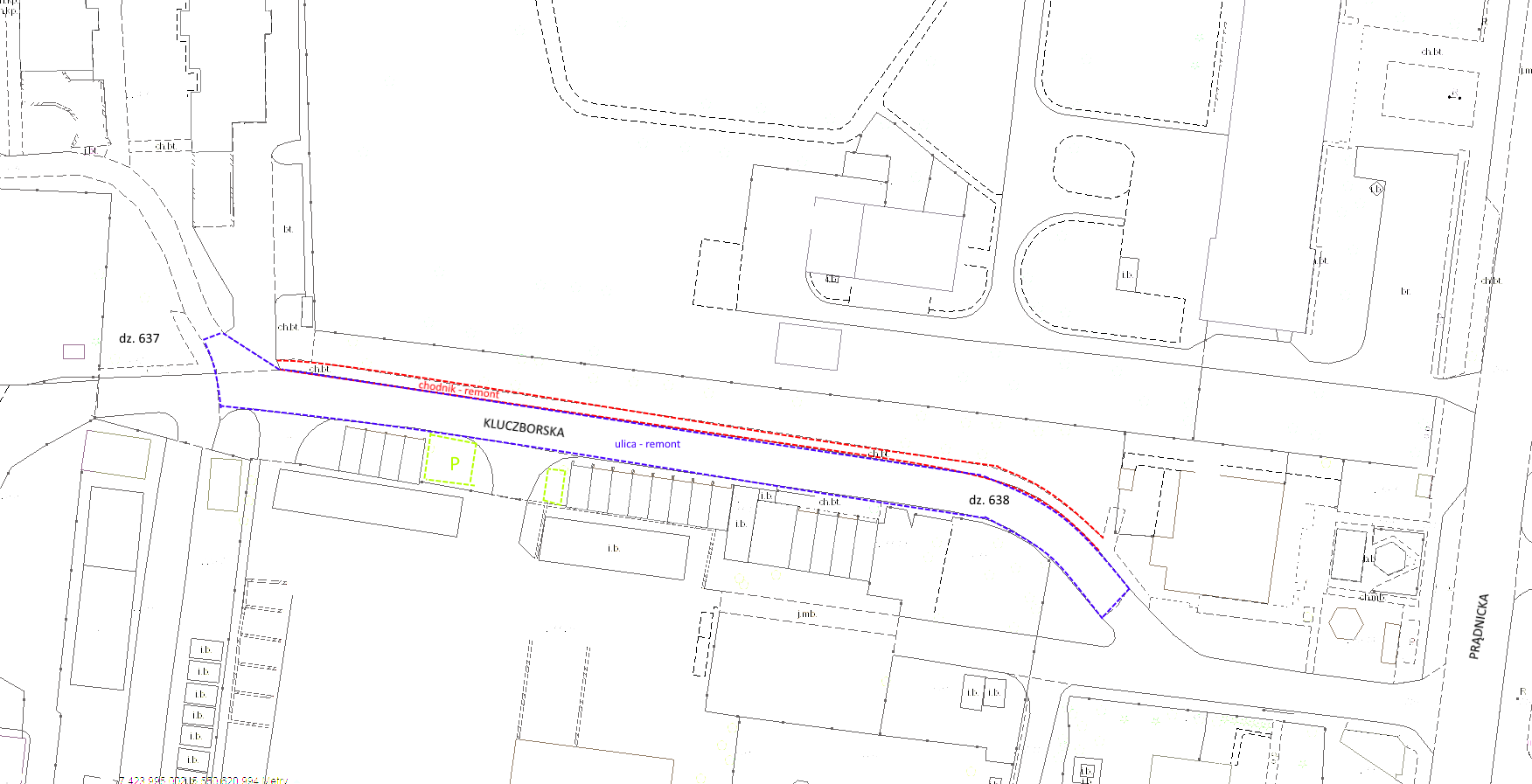 Remont ulicy Kluczborskiej wraz z chodnikiem na odcinku od Prądnickiej do Tauron, czyli odcinku ze starych betonowych płyt. Remont trzeba przeprowadzić póki jest przejazd przez tory tramwajowe, by uniknąć przejazdu sprzętu Tauronu przez osiedle.
