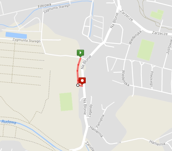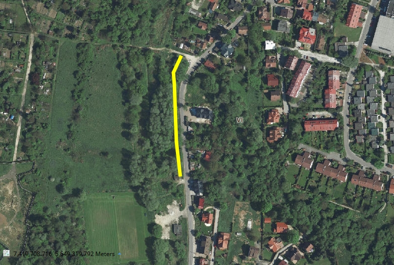 Główna lokalizacja: wschodnia część działki 161/5 obr. 1 Krowodrza (równolegle do ul. Na Błonie). Początek ścieżki na północy (przy drodze utwardzonej), koniec na południu (przy chodniku betonowym).)