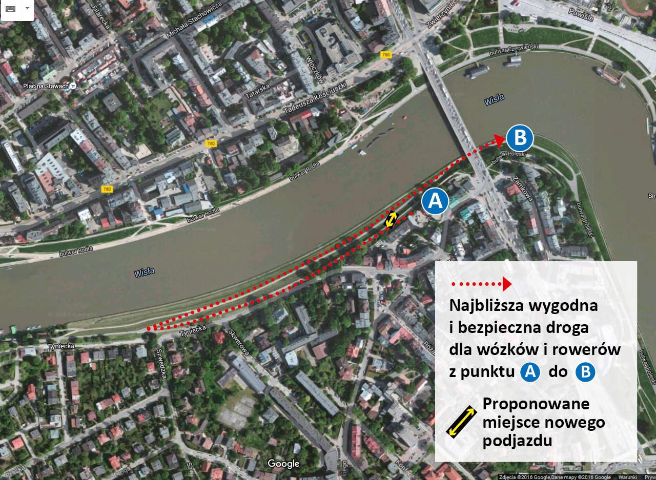 W Dzielnicy Dębniki sytuację tę poprawiłoby wybudowanie pochyłego zjazdu w pobliżu Rynku Dębnickiego i ul. Tynieckiej. Umożliwiłoby to bezpieczne przejście z wózkiem lub przejazd rowerem pod Mostem Dębnickim bez znacznego nakładania drogi.