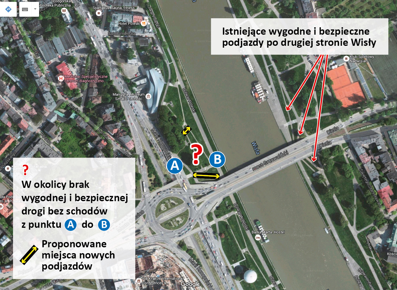 Ze względu na duże różnice w terenie, szczególnie istotne są połączenia wokół Mostu Grunwaldzkiego (Bulwar Wołyński i Poleski). Takie podjazdy z powodzeniem funkcjonują po drugiej stronie Wisły na Bulwarze Inflanckim.