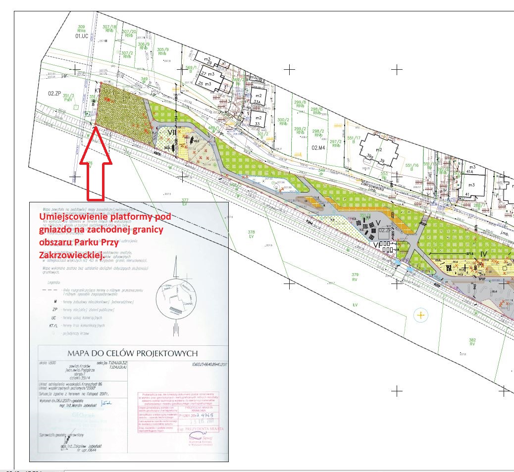 Projekt przewiduje zamontowanie drewnianego słupa z betonowym cokołem oraz platformą umożliwiającą bocianom założenie gniazda. Słup z platformą zlokalizowany byłby w najbardziej zachodnim roku projektowanego Parku Przy Zakrzowieckiej.