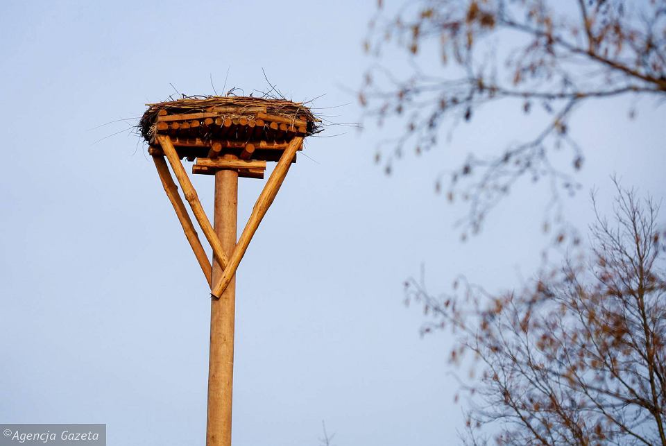 Zamontowanie drewnianego słupa z betonowym cokołem oraz platformą umożliwiającą bocianom założenie gniazda.