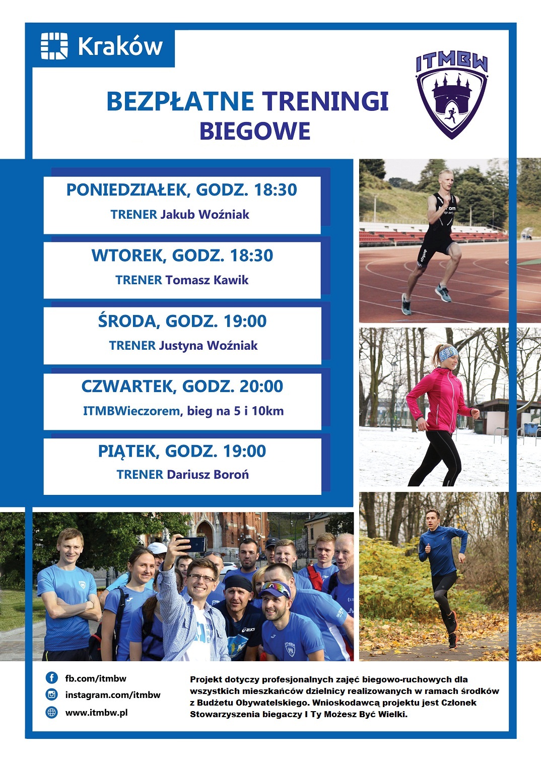 | Cotygodniowe profesjonalne zajęcia biegowo-ruchowe | Spotykamy się pod DH Wanda i Arką Pana co wtorek i piątek zawsze o godz. 19:00, przez okres od 1 marca do 30 listopada 2019 roku. | 2019 |