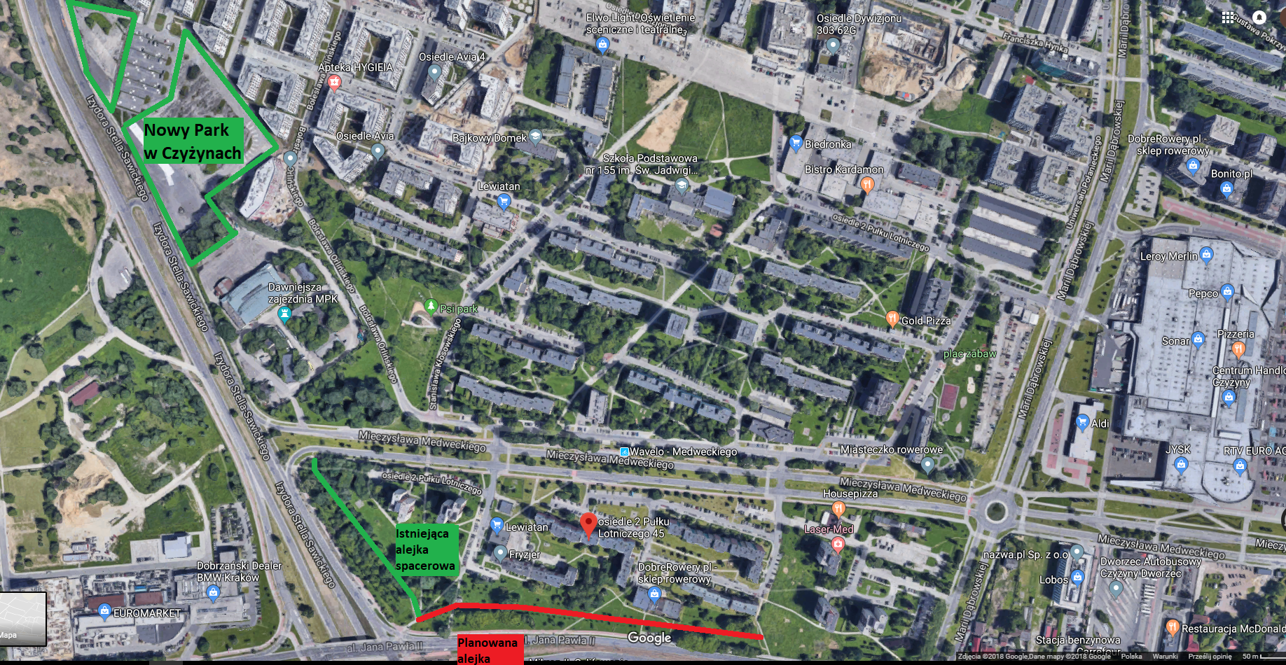 Utworzenie zielonego zakątka poprzez budowę asfaltowej alejki spacerowej, która będzie kontynuacją istniejącego ciągu spacerowego, wzdłuż ulicy Jana Pawła II. W miejscu planowanej alejki nasadzona jest już alejka drzewna pośrodku której istnieje przedept świadczący o potrzebie realizacji tego zadania. W tym miejscu będzie można swobodnie uczyć swoje pociechy jazdy na rolkach, hulajnogach czy też na rowerze - szeroka nawierzchnia asfaltowa to ułatwi. Zielony zakątek będzie swoistego rodzaju zieloną strefą buforową dla całego osiedla 2 Pułku Lotniczego pomiędzy ruchliwymi ulicami Stella-Sawickiego, al. Jana Pawła II oraz węzłem Rayskiego. Miejsce to będzie atrakcyjne na spacery dla okolicznych mieszkańców i nie tylko, ponieważ na wskazanym obszarze znajduje się ogólnodostępny parking z wjazdem od strony al. Jana Pawła II. W przyszłości istnieje bardzo duża perspektywa rozwoju zieleni urządzonej na tym obszarze.