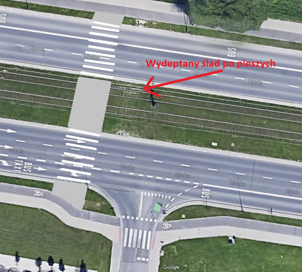 Zadanie polega na przywróceniu istniejącego przejścia dla pieszych (możliwość uzupełnienia o przejazd dla rowerów). W ramach zadania: wytyczenie przebiegu przejścia (wymalowanie pasów, przejście przez torowisko tramwajowe - wykonanie nawierzchni, wykonanie połączenia z istniejącymi chodnikami i ścieżką rowerową biegnących po obu stronach ulicy Lipskiej), ustawienie znaków, montaż sygnalizacji. Można też zrezygnować z instalacji sygnalizacji, jeśli pozwolą na to względy BRD