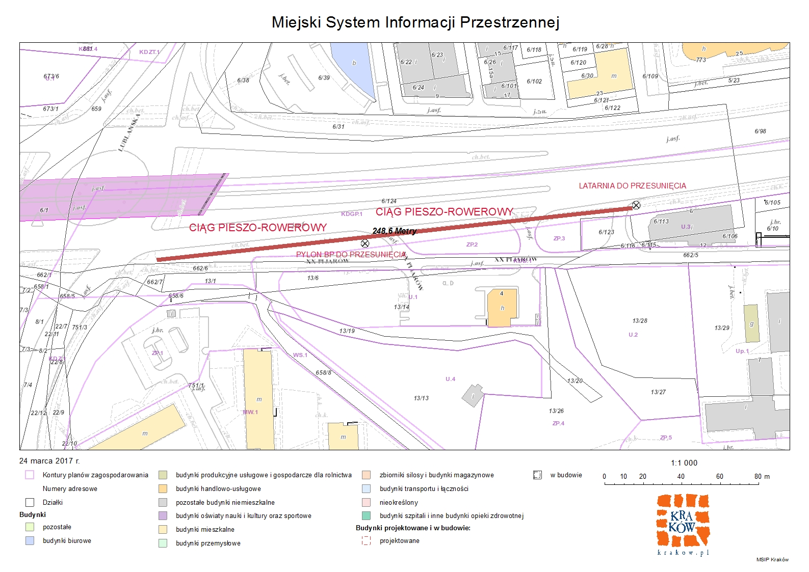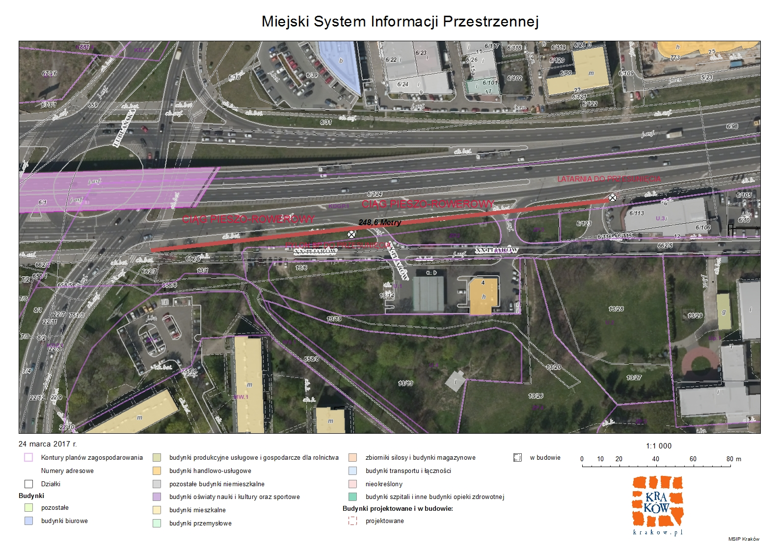 Budowa ciągu pieszo-rowerowego wzdłuż al.Bora Komorowskiego na odcinku od salonu samochodowego Toyota do ronda Polsadu wraz ze zmianą lokalizacji oświetlenia ulicznego (lampa przy salonie samochodowym) znajdującego się na aktualnym przebiegu ścieżki rowerowej. Dodatkowo projekt wymaga przesunięcia pylonu reklamowego stacji paliw BP.Zadanie realizowane będzie w pasie drogowym na nieruchomosci stanowiącej własnosć Gminy Kraków.(działka nr 6/124 obr. 4 Sródmiescie)