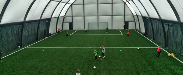Przykład realizacji hali łukowej z boiskiem o nawierzchni z trawy syntetycznej ze strony www.grimar.pl