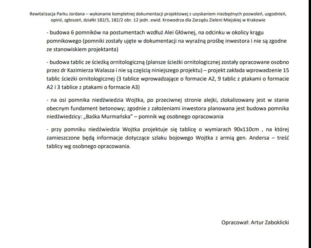 Tymczasem wbrew woli wielu mieszkańców, wbrew uchwale Radzie Dzielnicy Krowodrza i wbrew stanowisku projektanta władze miasta przeprowadziły „analizę dostępności terenu i chłonności programowej treści dydaktycznych pod kątem maksymalnej liczby postumentów możliwych do posadowienia bez zaburzenia harmonijnej i holistycznej koncepcji rewitalizacji parku". Oczywiście „analiza” wykazała, że można ustawić jeszcze w parku kolejnych 6 popiersi i drugiego niedźwiedzia. Dlatego pytamy: czemu i komu to ma służyć? Bo na pewno nie mieszkańcom.
