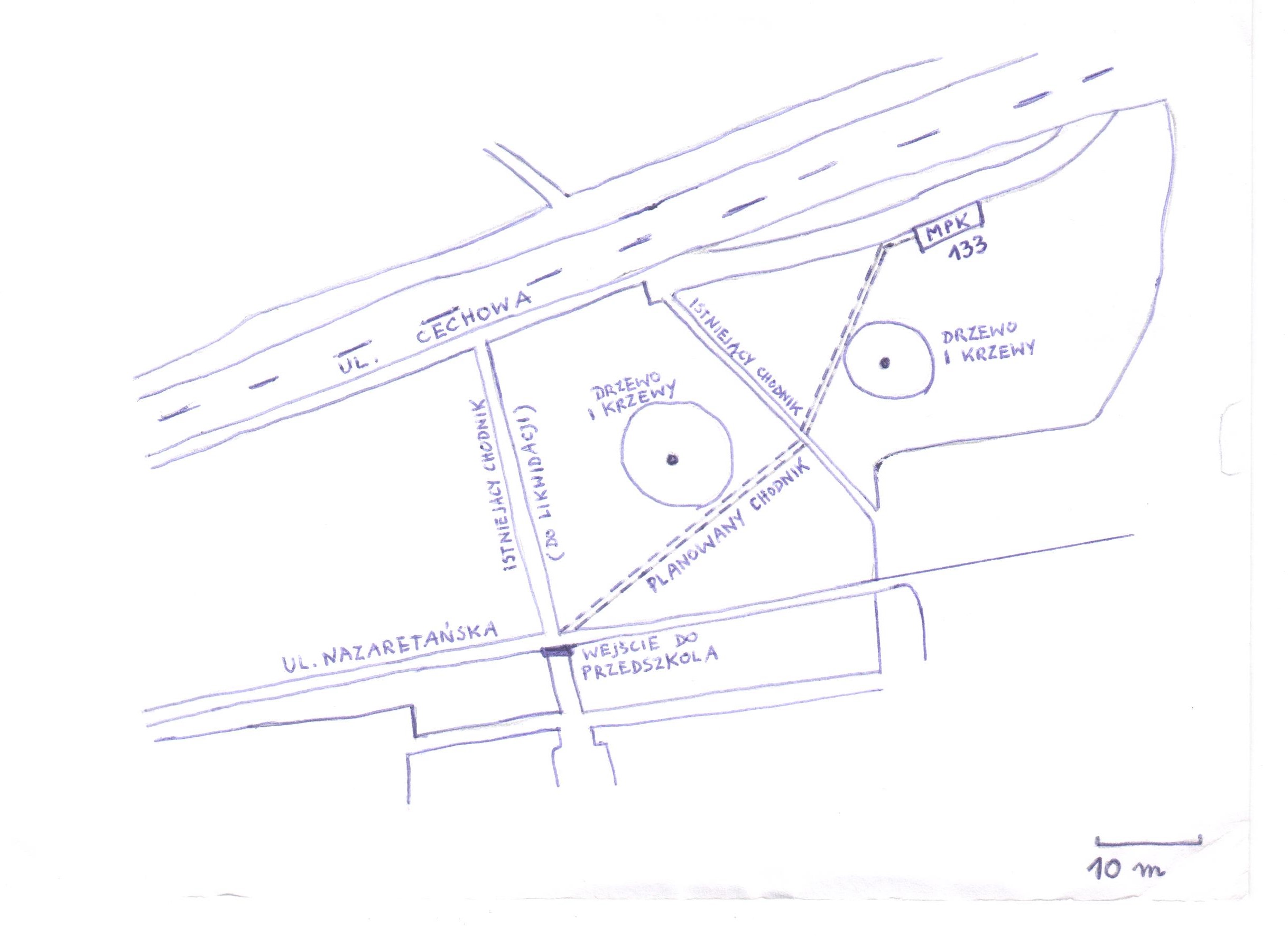 Budowa chodnika prowadzącego bezpośrednio od przystanku autobusowego linii 133 (ul. Cechowa) do wejścia do Publicznego Przedszkola Sióstr Nazaretanek w Krakowie (ul. Nazaretańska) i odwrotnie. W tym obszarze znajdują się już 2 (wąskie) chodniki, jednak w zupełnie innych kierunkach. Jeden z nich można usunąć całkowicie, a w jego miejsce posiać trawę.