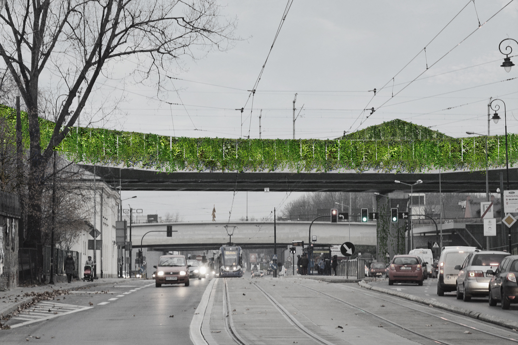 Pomysł polega na przekształceniu jaskrawoniebieskich ekranów akustycznych w horyzontalne ściany zieleni oraz wykorzystaniu terenów pod estakadami na miastotwórcze funkcje t.j. ławki, alejki, meble miejskie, skwer, boisko, plac zabaw, ścieżka rowerowa