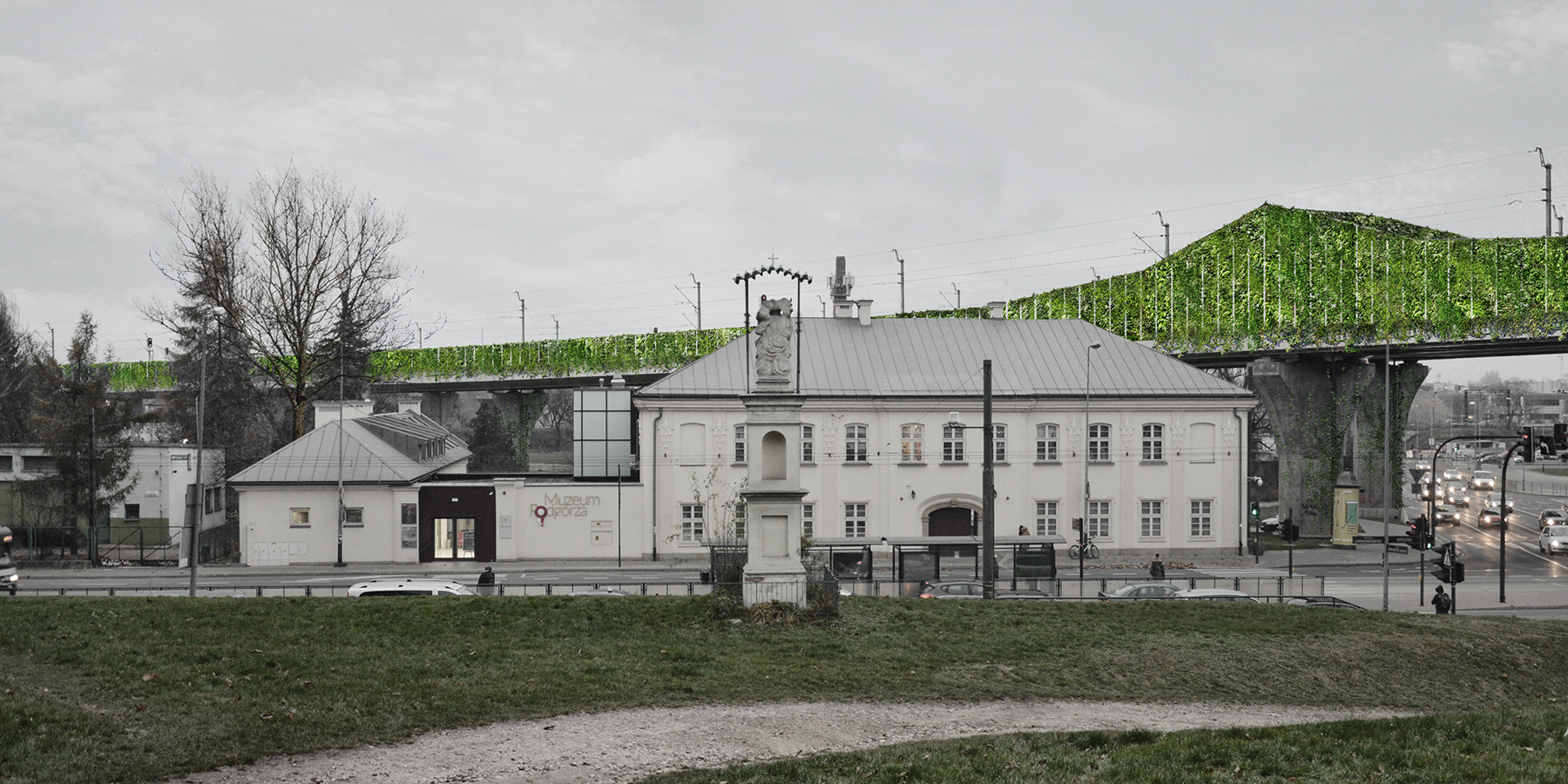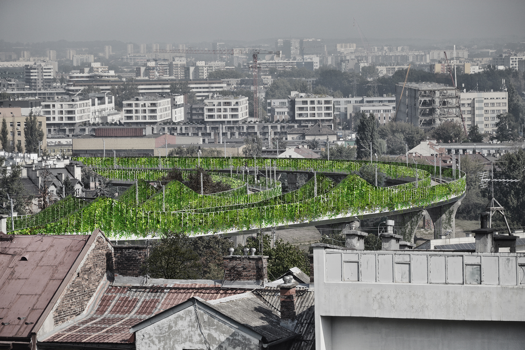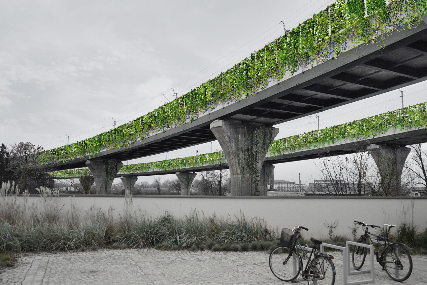 W krakowskim Starym Podgórzu mamy do czynienia z infrastrukturą kolejową, której projekt został potraktowany przez PKP jako zaspokojenie swoich podstawowych potrzeb. Jeśli jednak zmienimy perspektywę i popatrzymy na cały aspekt z perspektywy mieszkańca Podgórza widzimy ogromny krzykliwy niebieski obiekt, który nie daje nic miastu, tworząc dodatkowo estetyczną barierę (zdecydowali o zastosowaniu krzykliwego niebieskiego koloru na ekranach akustycznych oraz w całym pasie górnej konstrukcji). Pomysł polega na przekształceniu jaskrawoniebieskich ekranów akustycznych w horyzontalne ściany zieleni oraz wykorzystaniu terenów pod estakadami na różne miastotwórcze funkcje takich jak ławki, alejki, meble miejskie, mała architektura, skwer, mikropark, multifunkcjonalne boisko, plac zabaw, ścieżka rowerowa.