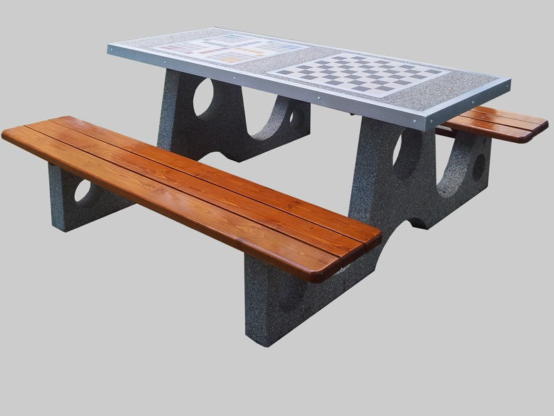 - betonowy stół z szachownicą i planszą do chińczyka z dwoma metalowo - drewnianymi ławami,