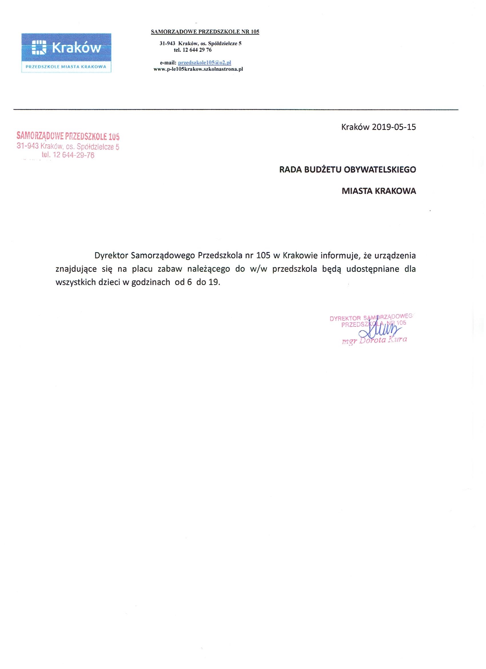 Samorządowe Przedszkola 105 jest zlokalizowane na os Spółdzielczym nr 5 i znajduje się w centrum Nowe Huty - między trzema osiedlami. Na terenie przedszkola znajduje się teren zielony (działka jest własnością Gminy Kraków) na którym obecnie są organizowane imprezy plenerowe oraz zajęcia rekreacyjne na świeżym powietrzu w szczególności dla dzieci z przedszkola.