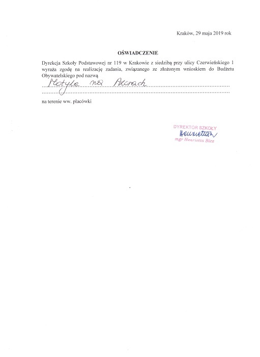 Mali ogrodnicy zaopiekują się motylami z wielką przyjemnością, mowa tu o uczniach SP nr 119. Na półeczce przed domkiem postawią mały pojemniczek na wodę z cukrem, wysieją kwiatki z załączonej paczki nasion, albo w doniczkach wyhodują ich sadzonki. Rozwijanie kreatywności dzieci i pielęgnacja ich wrażliwości na naturę przyniesie później profity. W ten sposób pokazujemy, że przyroda potrzebuje czasem naszego wsparcia, i zamiast ją niszczyć, zróbmy dla niej coś dobrego. Niech domek dla motyli spełni swoją rolę edukacyjną, niech otwiera dziecięce oczy na cudowny świat ogrodowych zwierząt. Domki zlokalizowane zostałyby na terenie ogrodu SP nr 119 w Krakowie; ogólnodostępnego dla mieszkańców i każdy bez wyjątku mógłby cieszyć oko pięknymi motylami. Na terenie szkoły znajduje się także plac zabaw zatem taki projekt byłby ciekawym uzupełnieniem istniejącej już "infrastruktury odkrywczej".