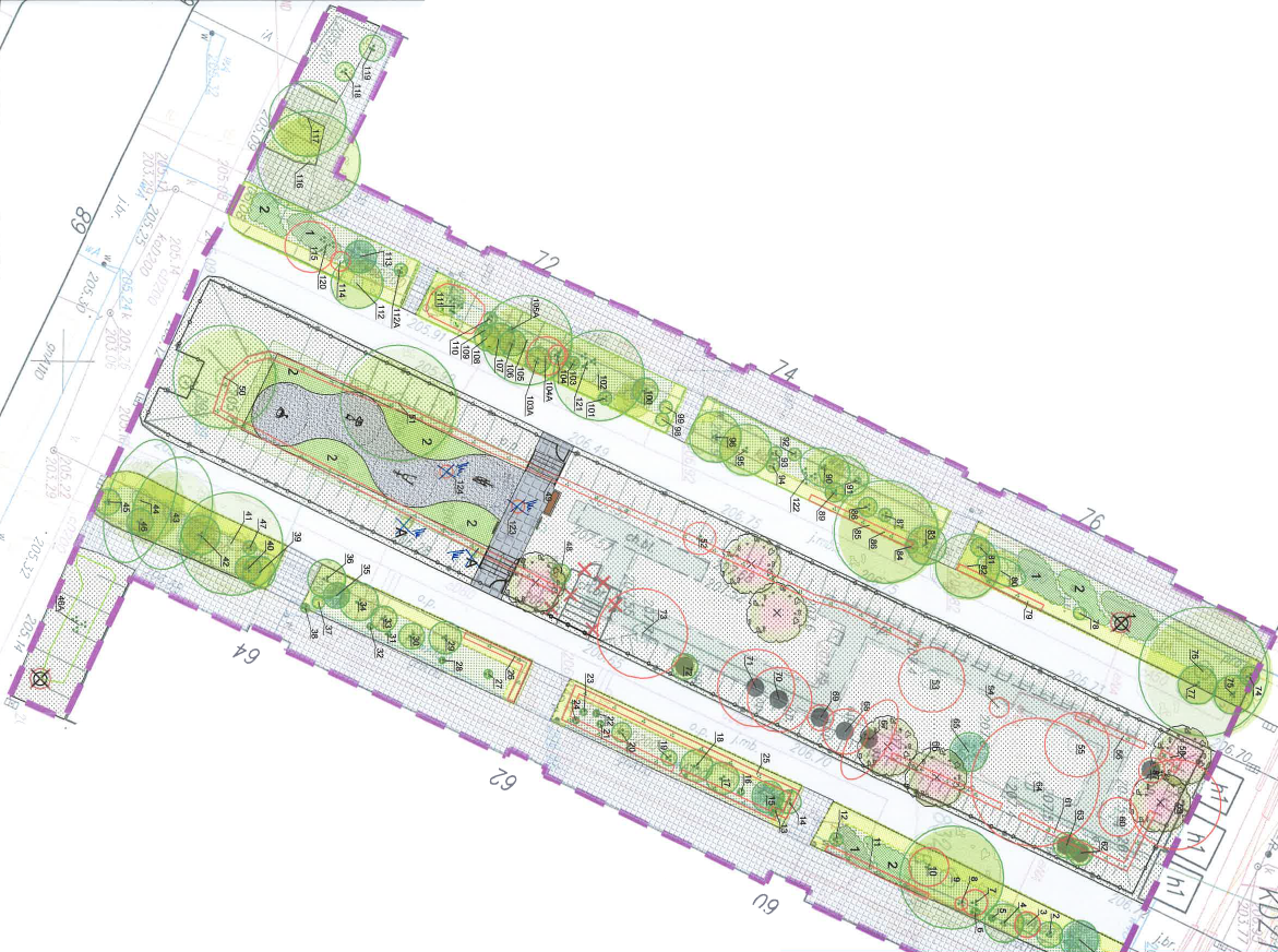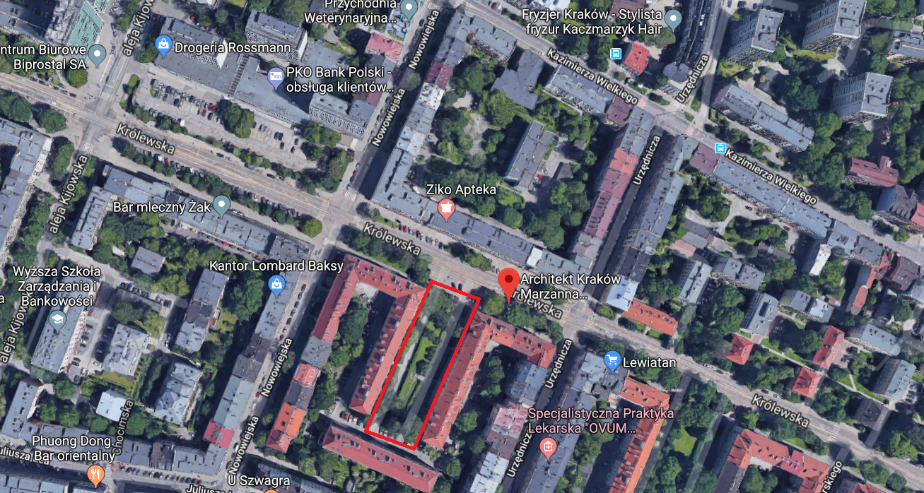 Dodatkowe lokalizacje: Obszar planowanego działania stanowi fragment działki nr 803/21 obr. 4 Krowodrza przy ul. Królewskiej pomiędzy budynkami nr 56-78, Kraków, Krowodrza, o powierzchni ok. 1050 m2