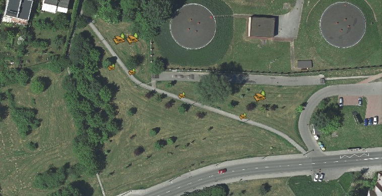 propozycja rozmieszczenia ławek (mniejszy symbol) i ławko-huśtawek (większy symbol)
