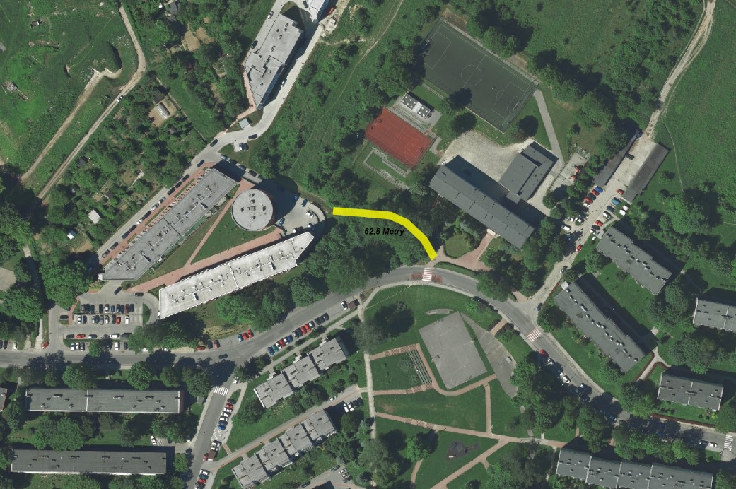 Główna lokalizacja: Fragment działki na przebiegu istniejacego przedeptu pomiędzy nowymi blokami a szkołą podstawową nr 129. Nr. działki 207/12 obr.10 Nowa Huta