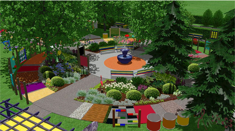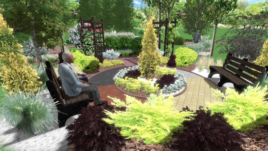 Ogród spotkań międzypokoleniowych z placem zabaw przyjaznym maluchom, z osobnym bezpiecznym miejscem dla dzieci szkolnych, powalającym rozwijać sprawności ruchowe, oraz ogrodem sensorycznym dla osób niepełnosprawnych i najstarszych mieszkańców.