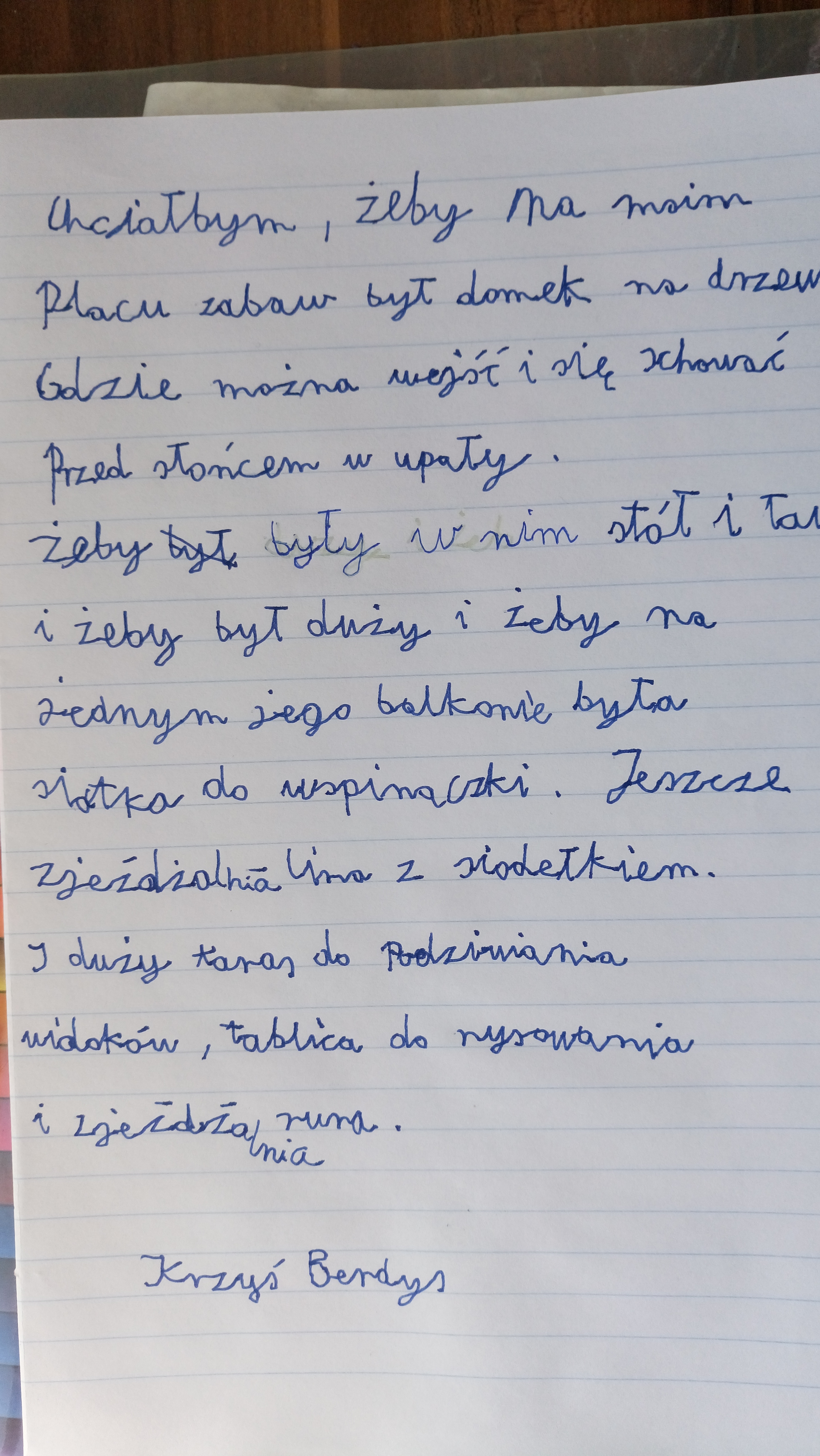 Pomysły na zmianę wyposażenia placu zabaw pochodzą od dzieci mieszkających w najbliższym otoczeniu Ogródka Jordanowskiego. Dzieci te spędzają na nim ogromne ilości czasu. Niektóre z dzieci bardzo rzadko wyjeżdżają poza miasto, nawet w okresie letnim i wakacyjnym. Podczas poprzednich wakacji chłopcy wymyślili zbudowanie domku na drzewie. Znosili z okolicy deski i próbowali za pomocą młotka i gwoździ zbudować sobie atrakcyjną kryjówkę. Bez powodzenia.
