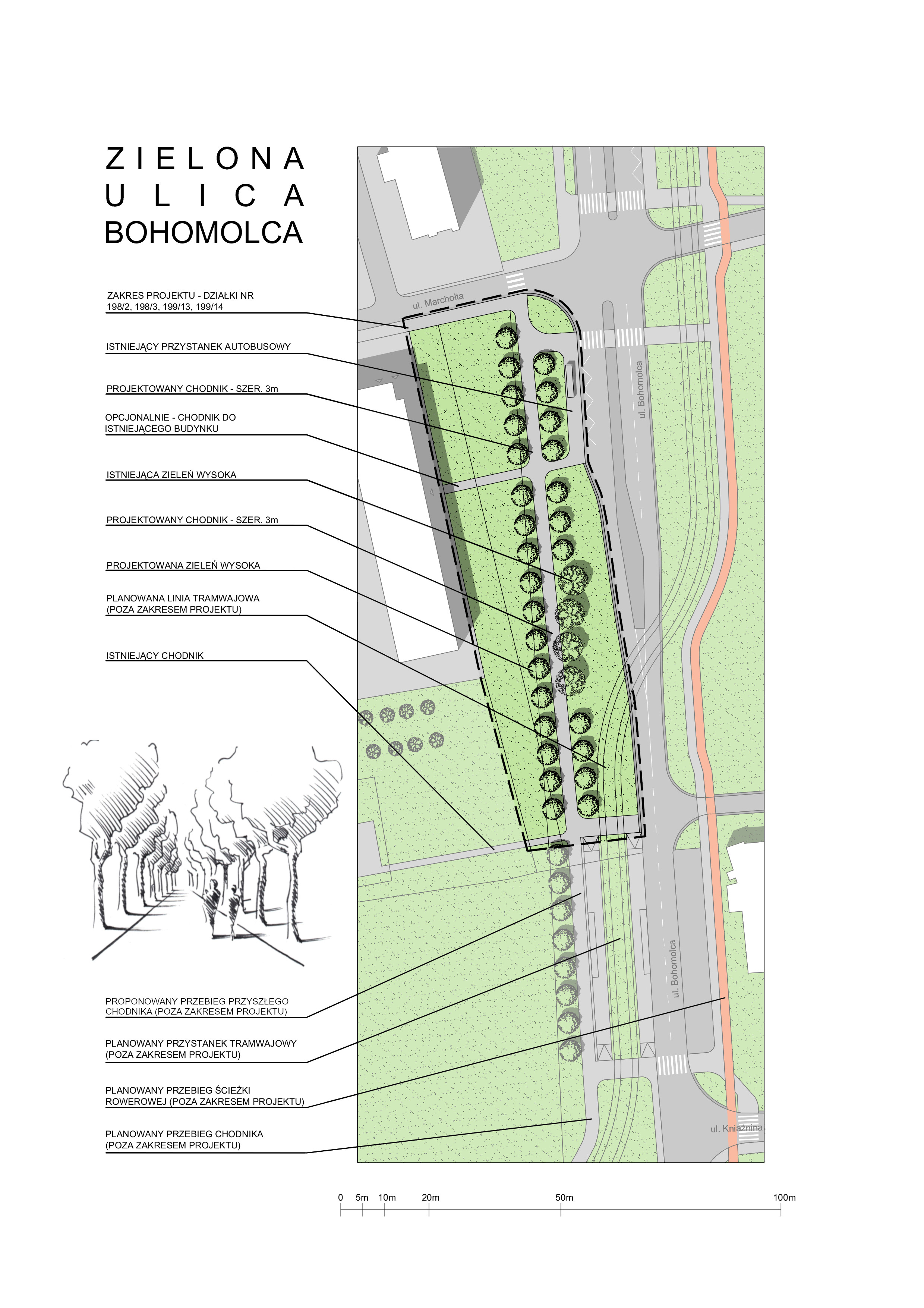 Budowa szerokiego chodnika, oddzielonego od jezdni pasem zieleni, oraz nasadzenie alejki drzew wzdłuż ul. Bohomolca. Projekt dotyczy zachodniej strony ulicy, na odcinku od skrzyżowania z ul. Marchołta do przyszłego przystanku tramwajowego.
