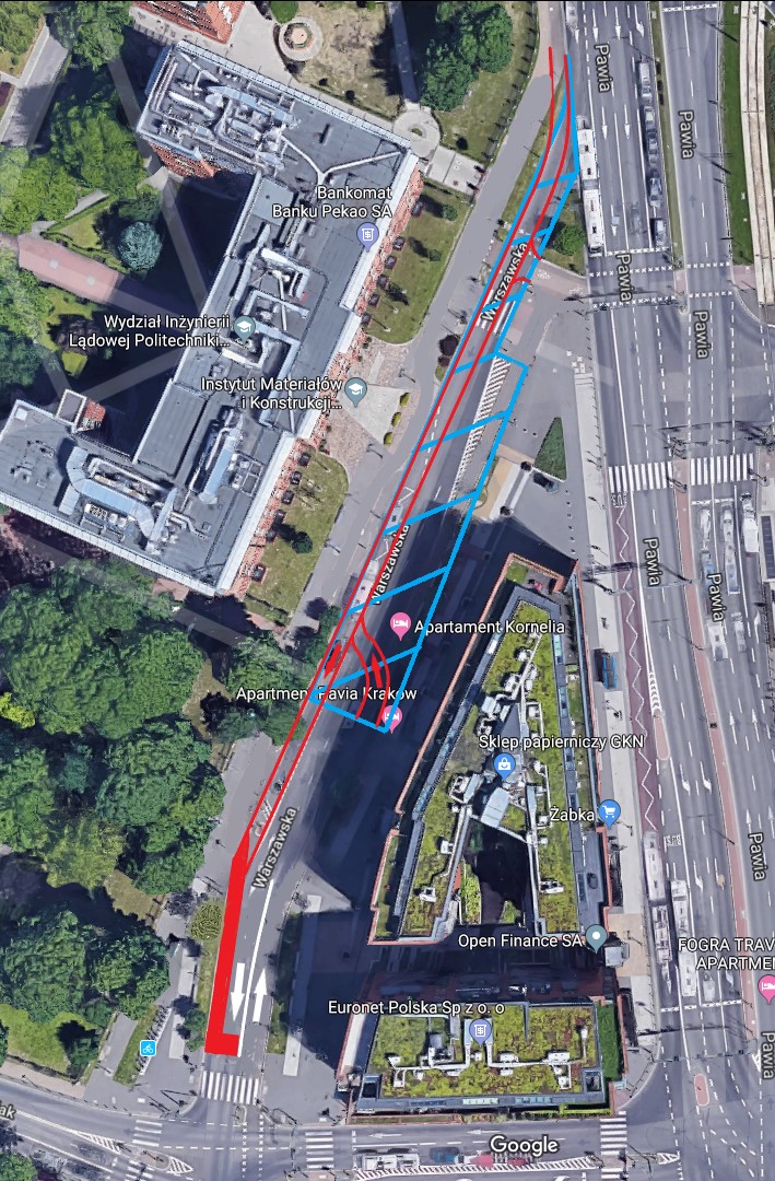Na niebiesko został oznaczony fragment ulicy Warszawskiej, który powinien zostać zamknięty z przeznaczeniem na nowy plac miejski. Na czerwono zaznaczono propozycję nowego przebiegu drogi dla rowerów wraz z pasem rowerowym i śluzą przy skrzyżowaniu. Abu zapewnić dojazd do podziemnego garażu pod budynkiem Angel City dalsza cześć ulicy Warszawskiej zostanie zamieniona z jedno- na dwukierunkową.