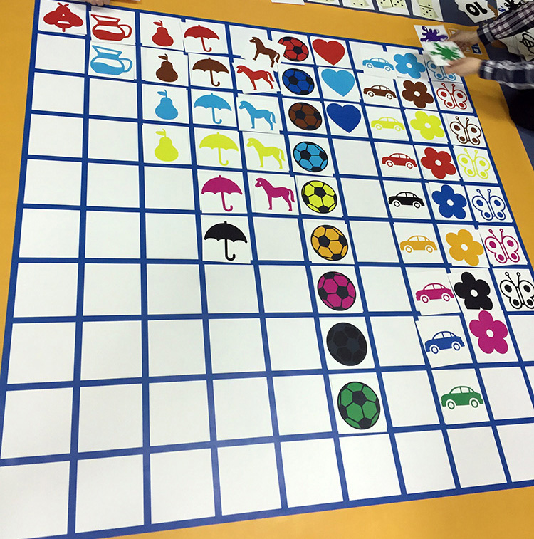 - kolorowe maty edukacyjne o wymiarach 180x180 cm i wymiarach pola 13x13 cm