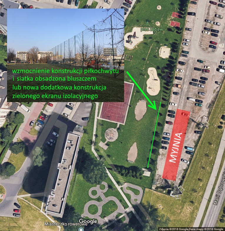Przebudowa piłkochwytu lub budowa innej zielonej bariery, która skutecznie odizoluje myjnię od placu zabaw przy ulicy Marii Dąbrowskiej.