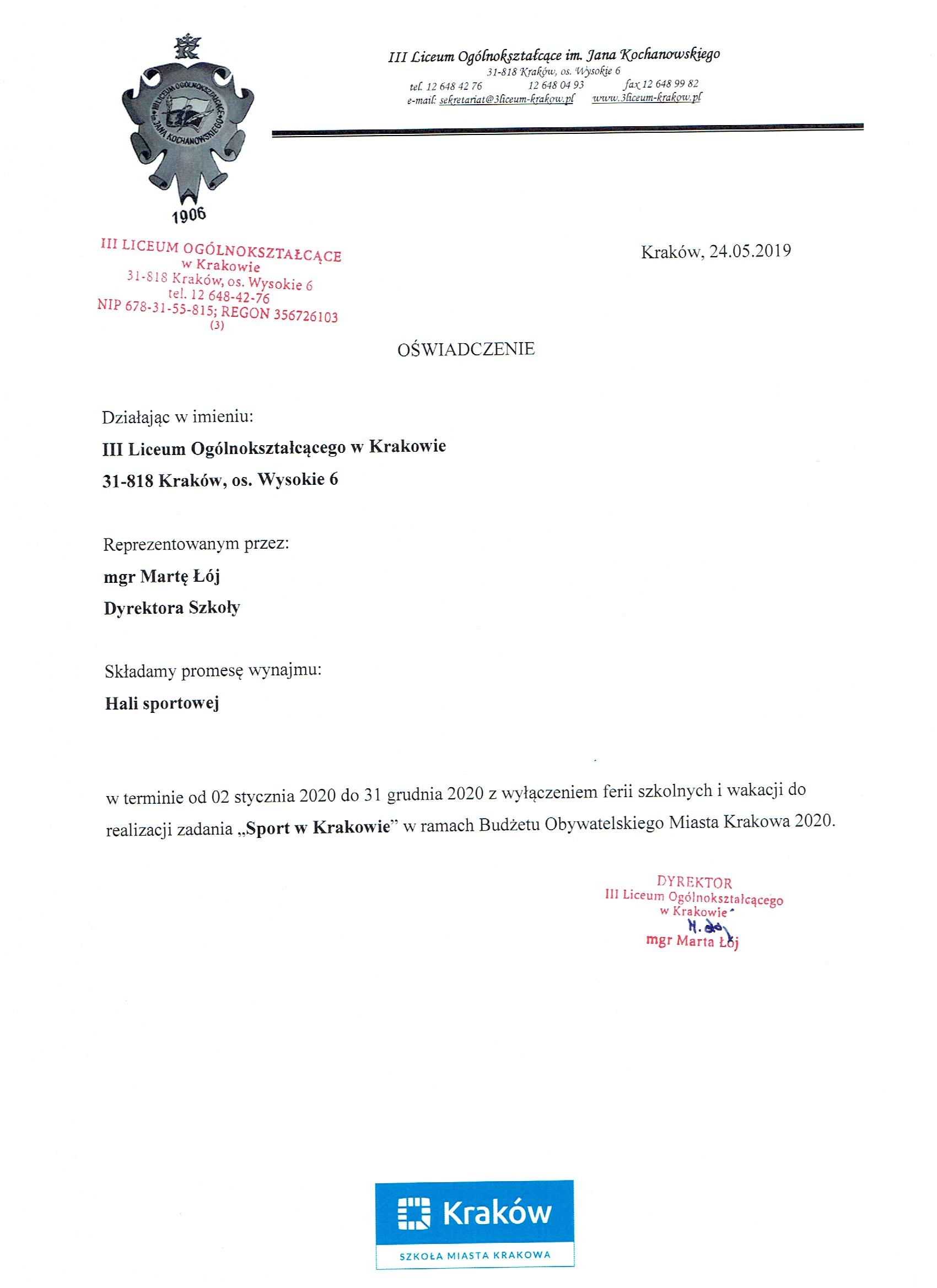 | Wynajem hal sportowych na wskazanych obiektach | Podpisanie umów na wynajem hal, i wybór miejsc do prowadzenia zajęć sportowych | 2.01- 31.12.2020 |