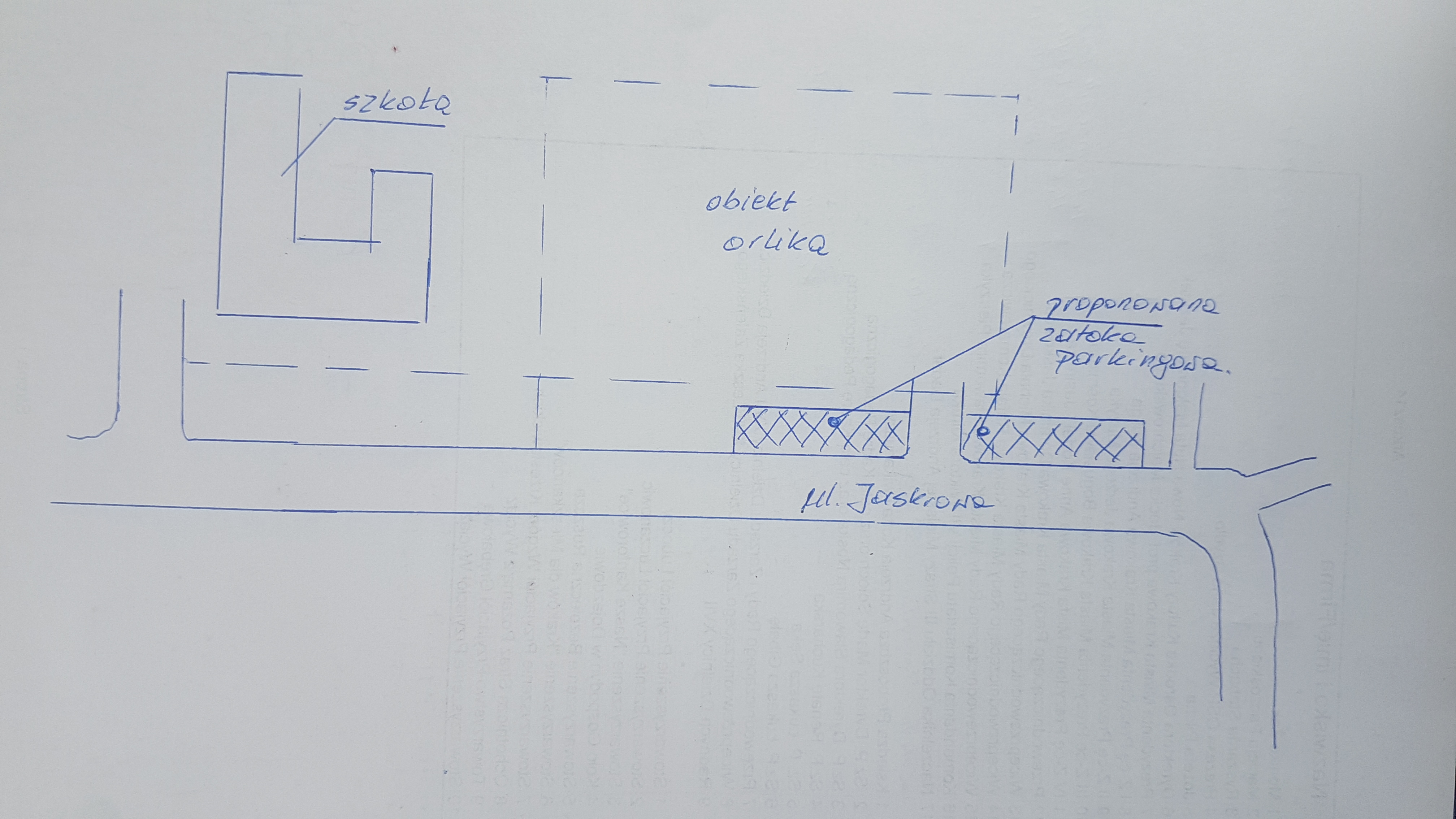 Wykonanie niezbędnych miejsc parkingowych przy obiekcie Orlik, ułatwiających parkowanie przy obiekcie jak i przejazd samochodów ul. Jaskrową. Miejsca te będą też wykorzystywane dla rodziców przywożących dzieci do szkoły.