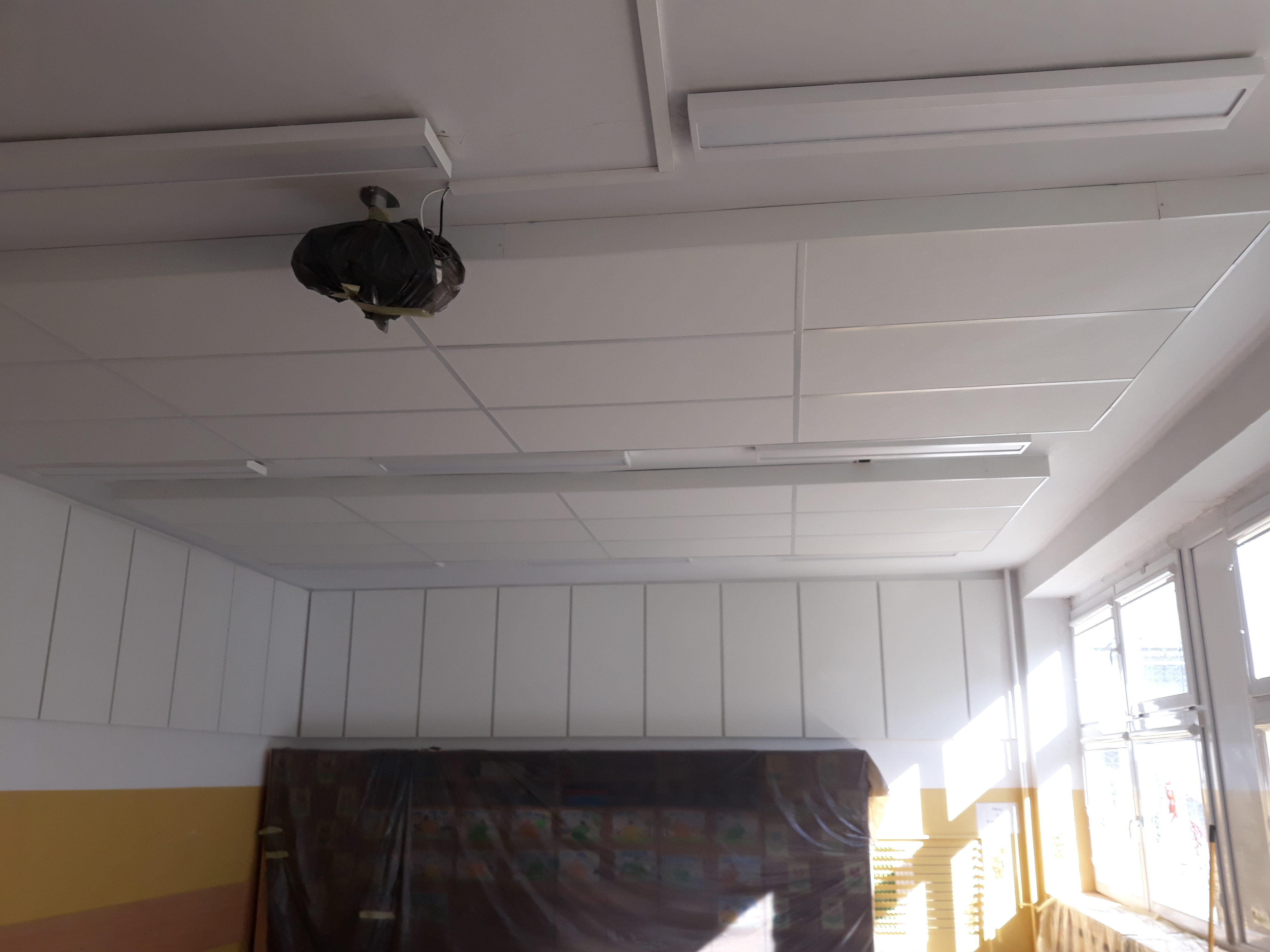 Celem zadania jest wygłuszenie hałasu na korytarzach, stołówce, świetlicy i sali muzycznej szkoły podstawowej. Oklejenie sufitów płytami dzwiękochłonnymi w salach z największym poziomem hałasu.