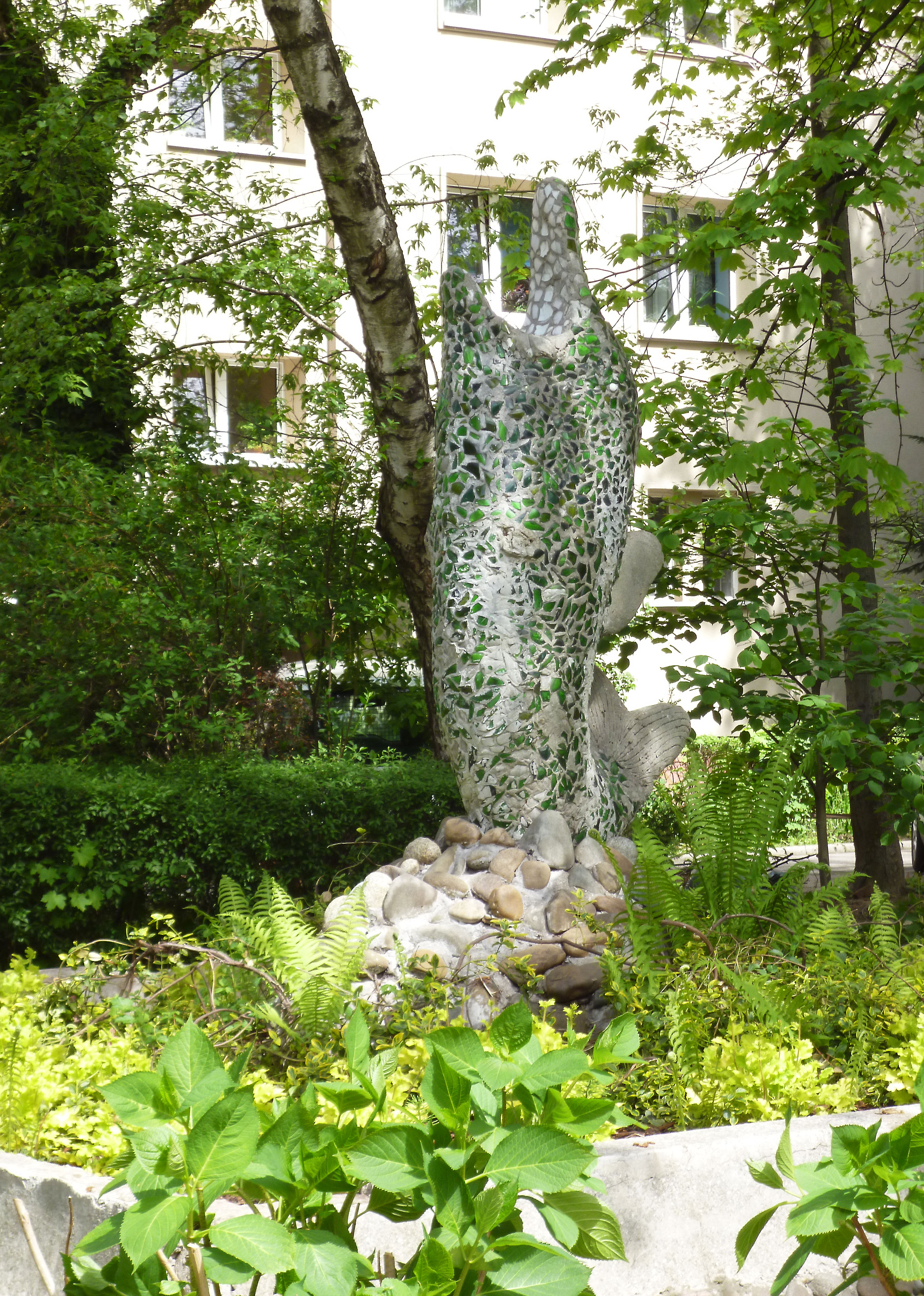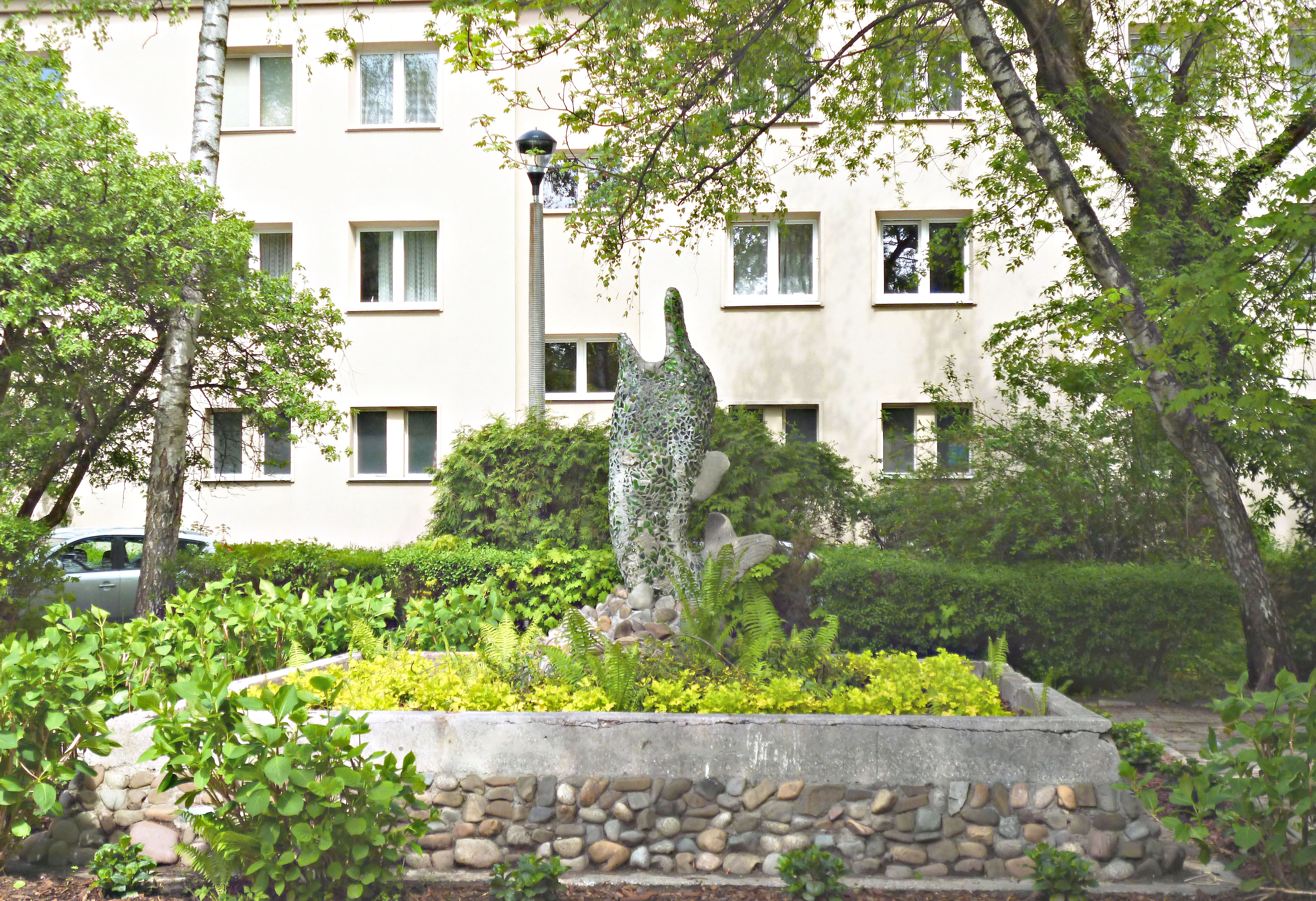 Nieczynna fontanna na Os. Górali - "Delfin", oddany do użytku w 1970 r. - łączy walory dzieła artystycznego z walorami społecznymi. Zdobienie rzeźby nawiązuje do popularnej w tamtym okresie techniki zdobnictwa mozaikowego, natomiast projekt i budowa fontanny były dziełem zaangażowanych społecznie mieszkańców Os. Górali. Miejsce było chętnie odwiedzane przez lokalną społeczność oraz artystów z pobliskiego Teatru Ludowego. Niestety, wskutek zaniechania budowy obiegu zamkniętego i zabudowania przejścia między blokami 23-24 (co wiązało się z odcięciem dotychczasowego doprowadzenia wody) fontanna przestała funkcjonować. Kilkanaście lat temu misa niszczejącej fontanny została zasypana ziemią i obsadzona roślinami, doraźnie pielęgnowanymi przez mieszkańców osiedla.