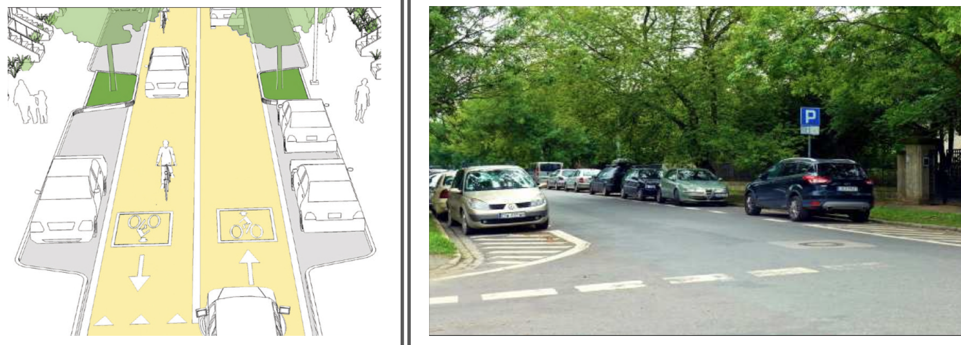 Wykorzystać do tego można dodatkowo pas o szerokości jednej płytki chodnikowej, który ciągnie się wzdłuż ulicy i oddziela asfaltową jezdnię od pasa zieleni. To aktualne rozwiązanie nie zapewnia optymalnego wykorzystania cennej przestrzeni miejskiej – zaanektowanie tego pasa na potrzeby parkingowe umożliwiłoby wyznaczenie miejsc parkingowych po obu stronach ulicy. Korzyści takiego rozwiązania są wielostronne – znaczące zwiększenie miejsc parkingowych oraz uspokojenie ruchu poprzez zwężenie jezdni.