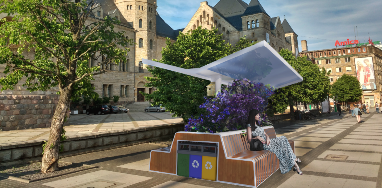 - montaż ławki ekologicznej zbierającej wodę deszczową oraz energię słoneczną (woda mogłaby posłużyć do podlewania okolicznej roślinności, a pozyskana energia do zasilenia pompy wodnej),
