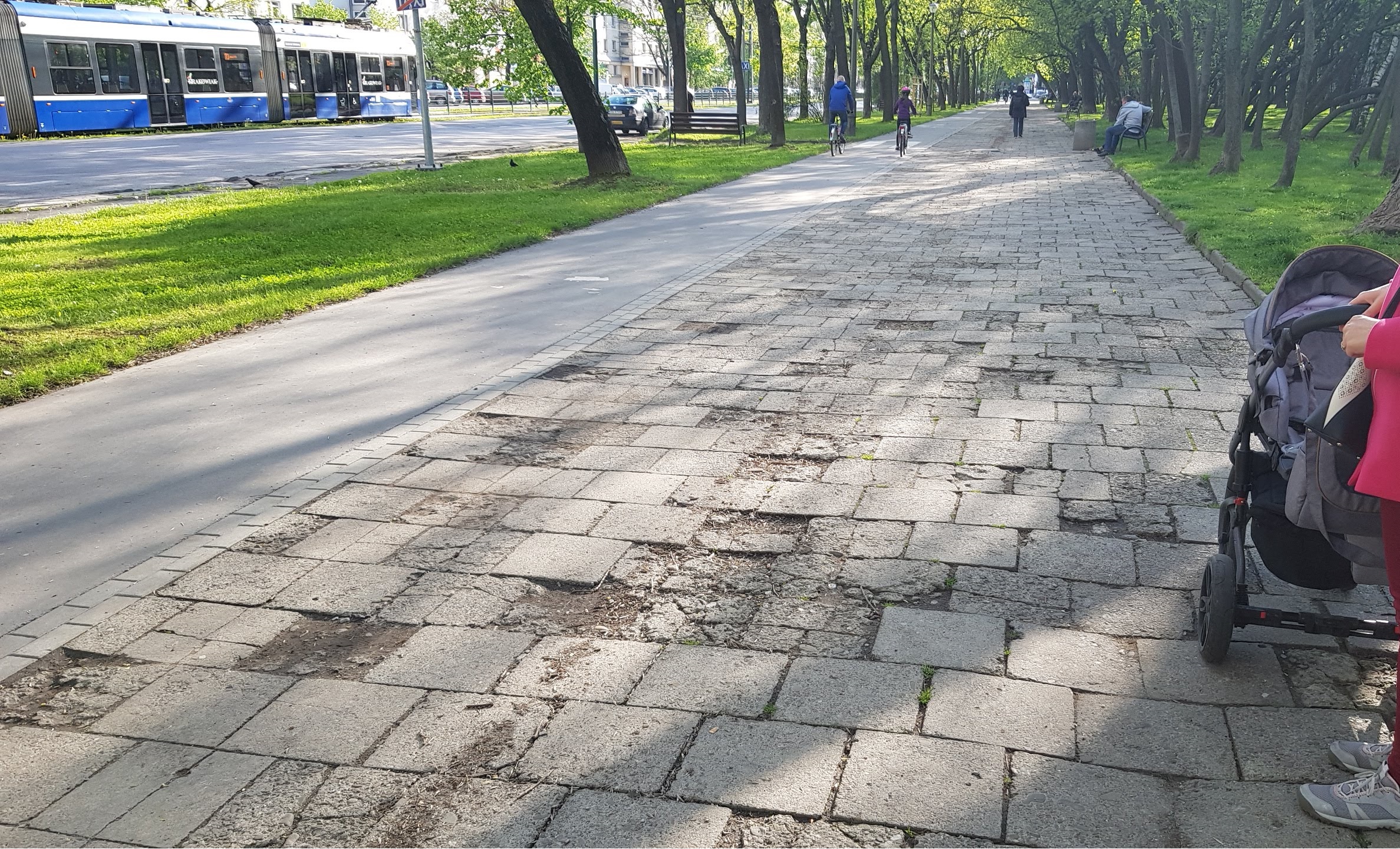 Chodnik aktualnie jest w opłakanym stanie. Cały jest popękany i występują dziury po brakujących płytach. Idąc łatwo się wywrócić a dziecko w wózku narażone jest na nieprzyjemne telepanie. Konieczna jest jego pilny remont. Nowa nawierzchnia ułatwi dotarcie do kościoła i nad Zalew Nowohucki od strony placu Centralnego.