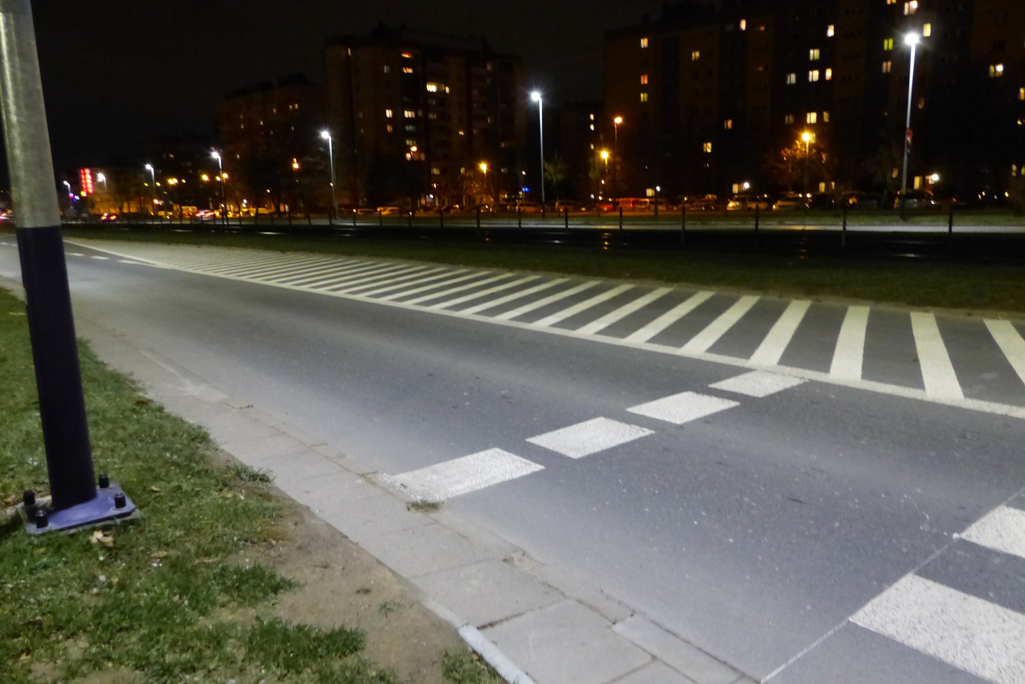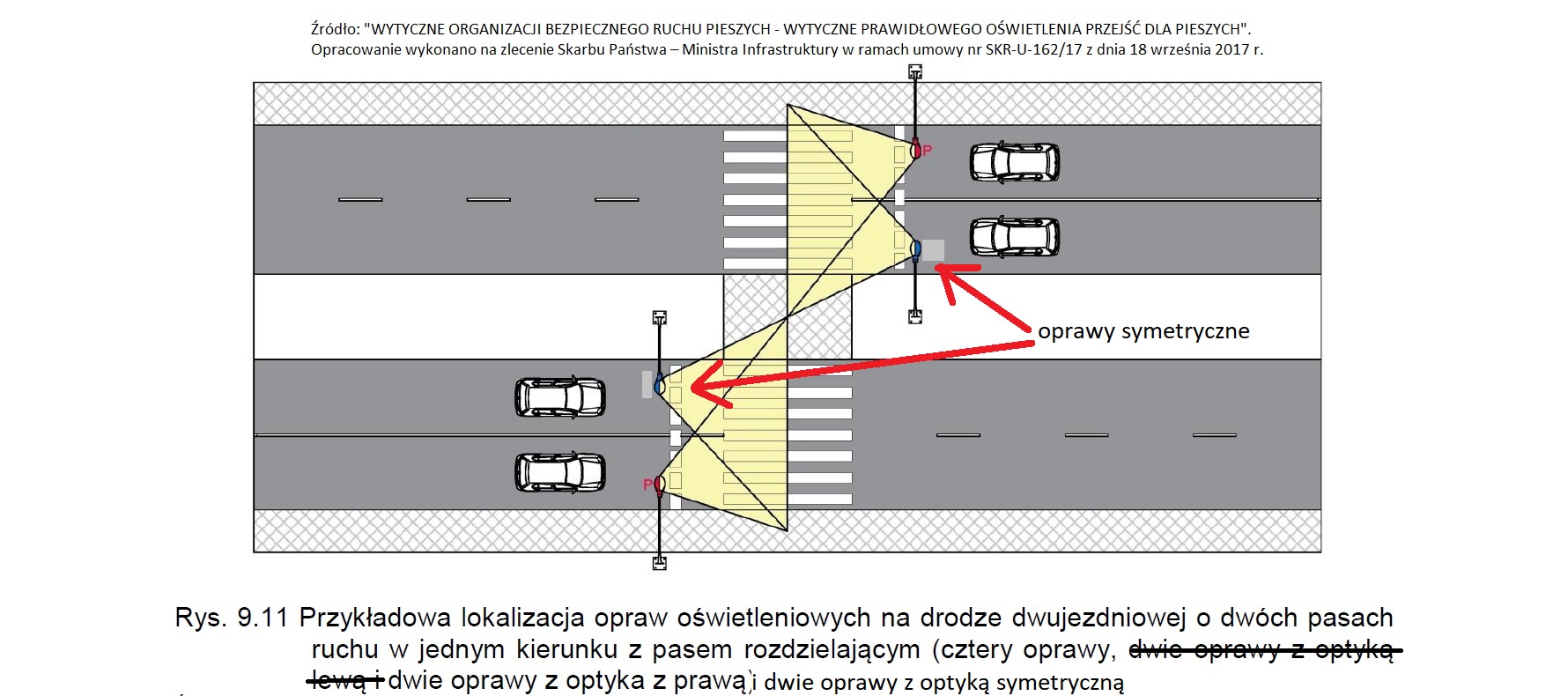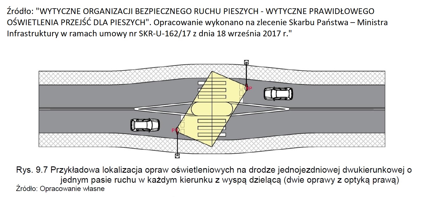 ad.2. W chwili obecnej istniejące oprawy oświetleniowe oświetlają tylko jezdnie, a granica światłocienia kończy się właśnie w miejscu gdzie zaczyna się rejon przejścia dla pieszych i przejazdy dla rowerzystów. Po zmianie opraw na LED nie ma światła na chodnikach, a więc kierowca nie widzi nie tylko samego przejścia ale i jego otoczenia. Jest to teren o dużym natężeniu ruchu pieszego. Mieszkańcy osiedla Piastów przechodzą przez jezdnię, aby dostać się do tramwaju. Mieszkańcy os. Bohaterów Września przechodzą do punktów handlowych lub do przystanków autobusowych zlokalizowanych po wschodniej stronie ulicy na terenie os. Piastów (nieco poniżej tego przejścia). W chwili obecnej przejścia oświetlone są zgodnie z normą 13201, która nie uwzględnia przejść dla pieszych czy rowerzystów. Dlatego tym bardziej wskazane jest wykonanie oświetlenia zgodnie z najnowszymi wytycznymi ministerstwa infrastruktury (WYTYCZNE PRAWIDŁOWEGO OŚWIETLENIA PRZEJŚĆ DLA PIESZYCH". Opracowanie wykonano na zlecenie Skarbu Państwa – Ministra Infrastruktury w ramach umowy nr SKR-U-162/17 z dnia 18 września 2017 r.).