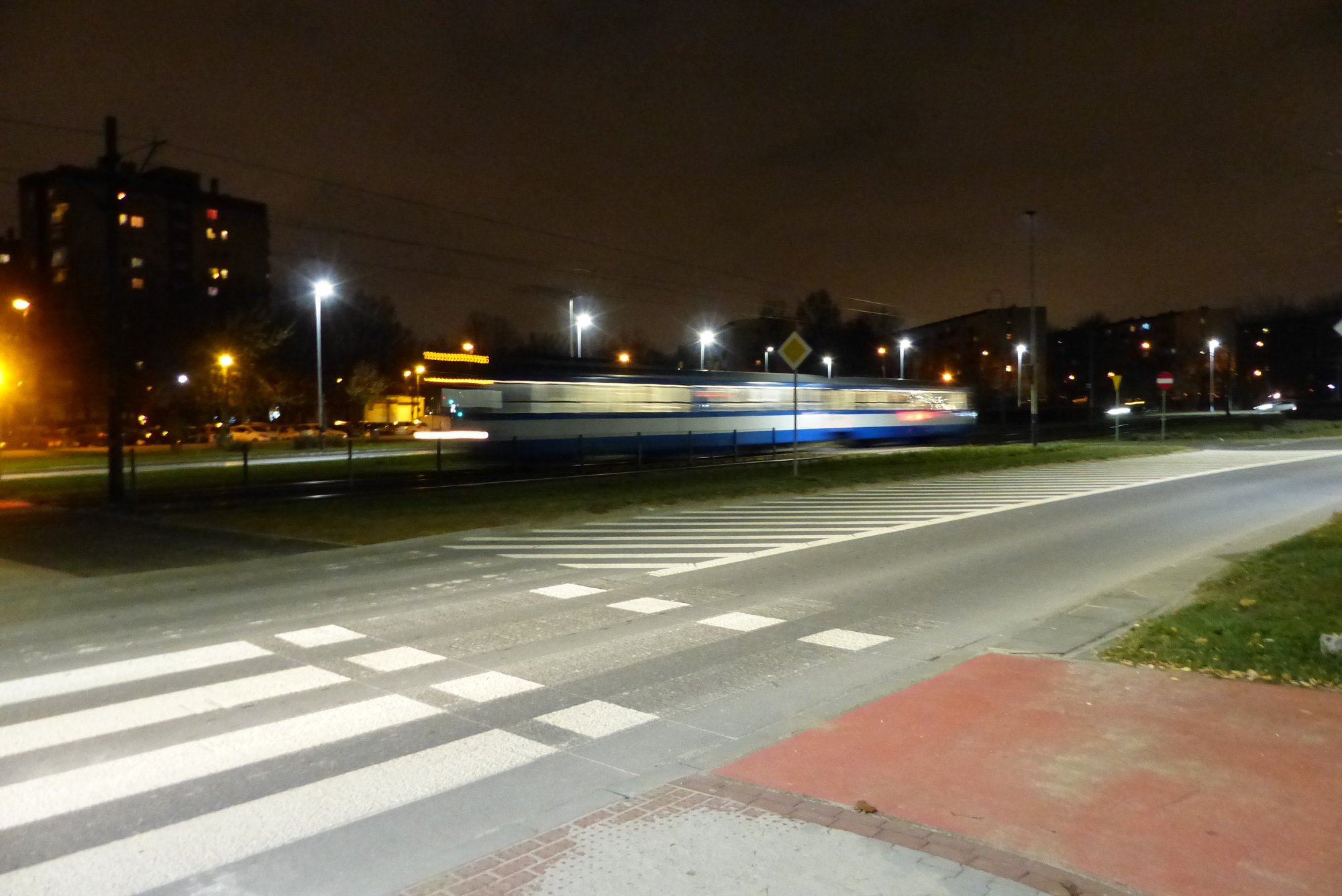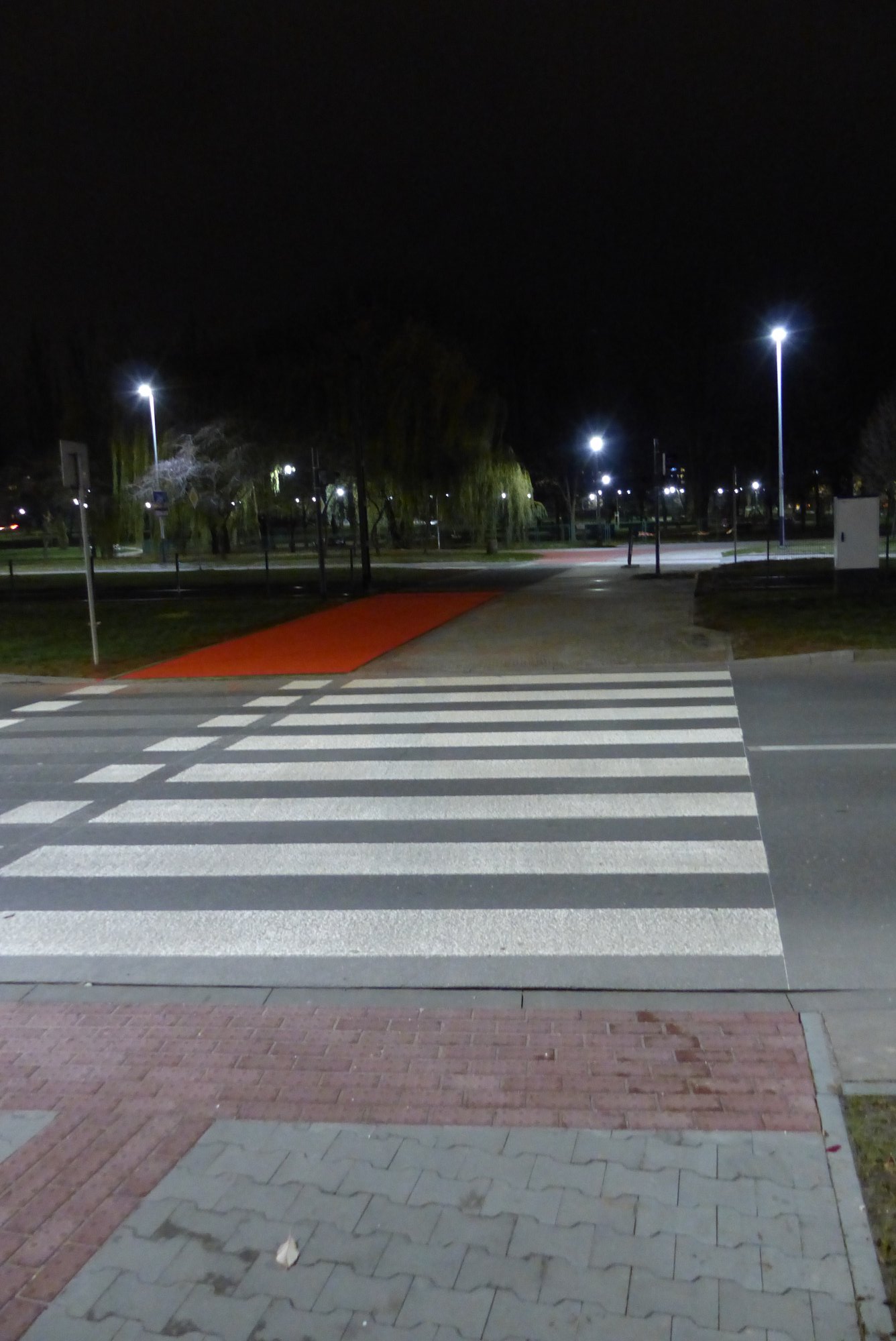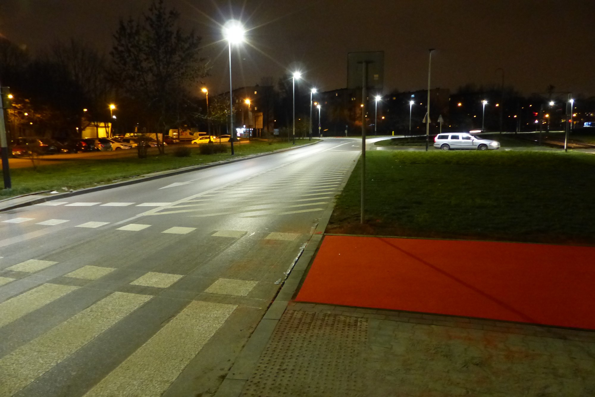 ad.2. W chwili obecnej istniejące oprawy oświetleniowe oświetlają tylko jezdnie, a granica światłocienia kończy się właśnie w miejscu gdzie zaczyna się rejon przejścia dla pieszych i przejazdy dla rowerzystów. Po zmianie opraw na LED nie ma światła na chodnikach, a więc kierowca nie widzi nie tylko samego przejścia ale i jego otoczenia. Jest to teren o dużym natężeniu ruchu pieszego. Mieszkańcy osiedla Piastów przechodzą przez jezdnię, aby dostać się do tramwaju. Mieszkańcy os. Bohaterów Września przechodzą do punktów handlowych lub do przystanków autobusowych zlokalizowanych po wschodniej stronie ulicy na terenie os. Piastów (nieco poniżej tego przejścia). W chwili obecnej przejścia oświetlone są zgodnie z normą 13201, która nie uwzględnia przejść dla pieszych czy rowerzystów. Dlatego tym bardziej wskazane jest wykonanie oświetlenia zgodnie z najnowszymi wytycznymi ministerstwa infrastruktury (WYTYCZNE PRAWIDŁOWEGO OŚWIETLENIA PRZEJŚĆ DLA PIESZYCH". Opracowanie wykonano na zlecenie Skarbu Państwa – Ministra Infrastruktury w ramach umowy nr SKR-U-162/17 z dnia 18 września 2017 r.).