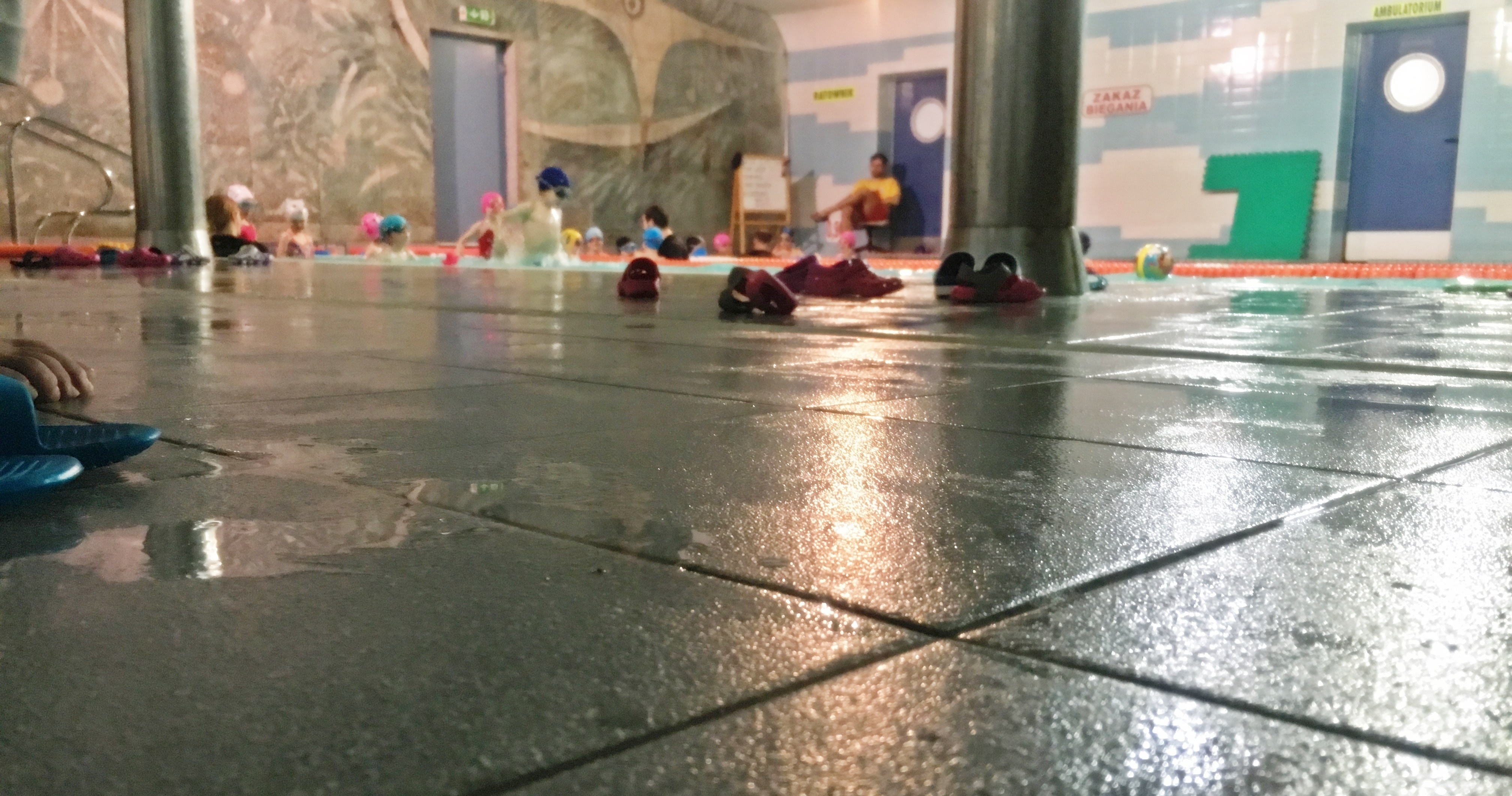 Niestety otoczenie basenu są pokryte płytkami - co powoduję że jest tam bardzo ślisko. Dzieciaki niestety często korzystają z łazienki w trakcie zajęć i niejednokrotnie dochodzi do wypadków i stłuczenia w najlepszym wypadku kości ogonowej.
