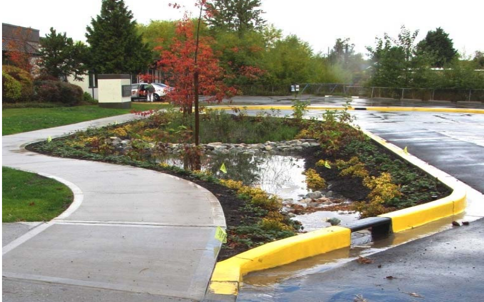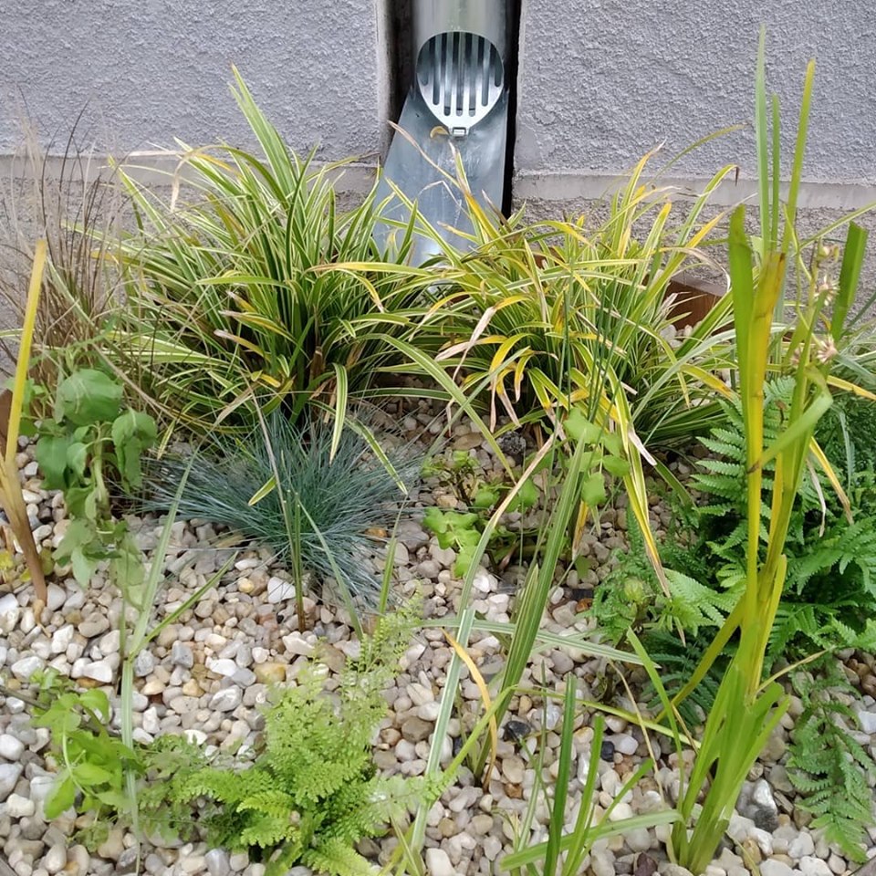 W centralnej części zasadzane są specjalnie rośliny "wodolubne", które dodatkowo oczyszczają deszczówkę, dzięki czemu poprawia się jakość wód gruntowych i powierzchniowych. Korzenie i kłącza roślin hydrofitowych wychwytują z wody zanieczyszczenia takie jak metale ciężkie czy związki biogenne. W polskich warunkach klimatycznych dobrze sprawdzają się turzyce, sity czy nasze rodzime paprocie. Nie jest konieczne obsadzanie całego ogrodu hydrofitami, jednak zaleca się dobranie takich roślin, które znoszą okresy suszy i zalewania.