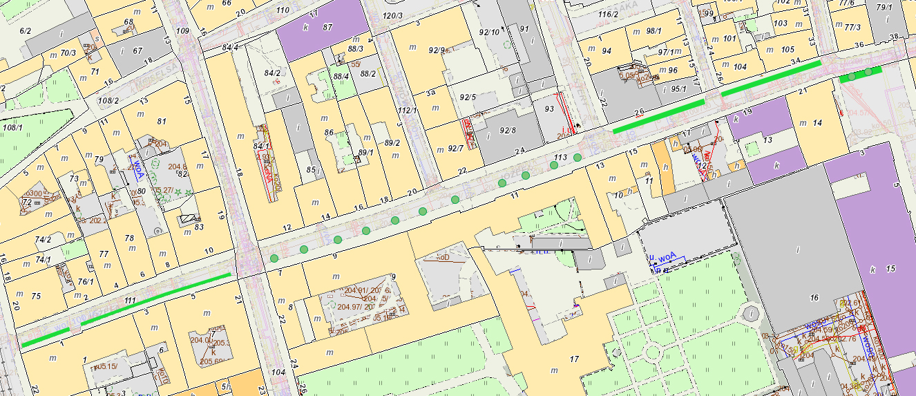 - pasu zieleni z 2 drzewami na odcinku między Jakuba - Wąską.