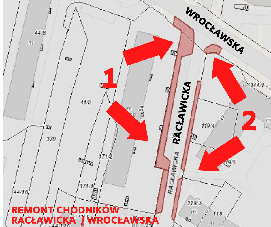 - remont chodnika przy ulicy Racławickiej (strona parzysta) – odcinek położony wzdłuż bloku przy ulicy Racławickiej 54, na odcinku od skrzyżowania z ulicą Wrocławską, dalej w ciągu wyznaczonych przed ww. budynkiem miejsc parkingowych do skrzyżowania z ulicą Litewską (bar Pasibrzuch) - położenie nowej kostki niefazowanej (dostosowanie do potrzeb osób z niepełnosprawnościami, osób starszych i rodziców z wózkami), w przypadku przejścia dla pieszych montaż wypustek dla osób niewidzących lub słabowidzących na skrajni chodnika przed pasami oraz odpowiednimi spadami. Nr 1 na dołączonych mapach.