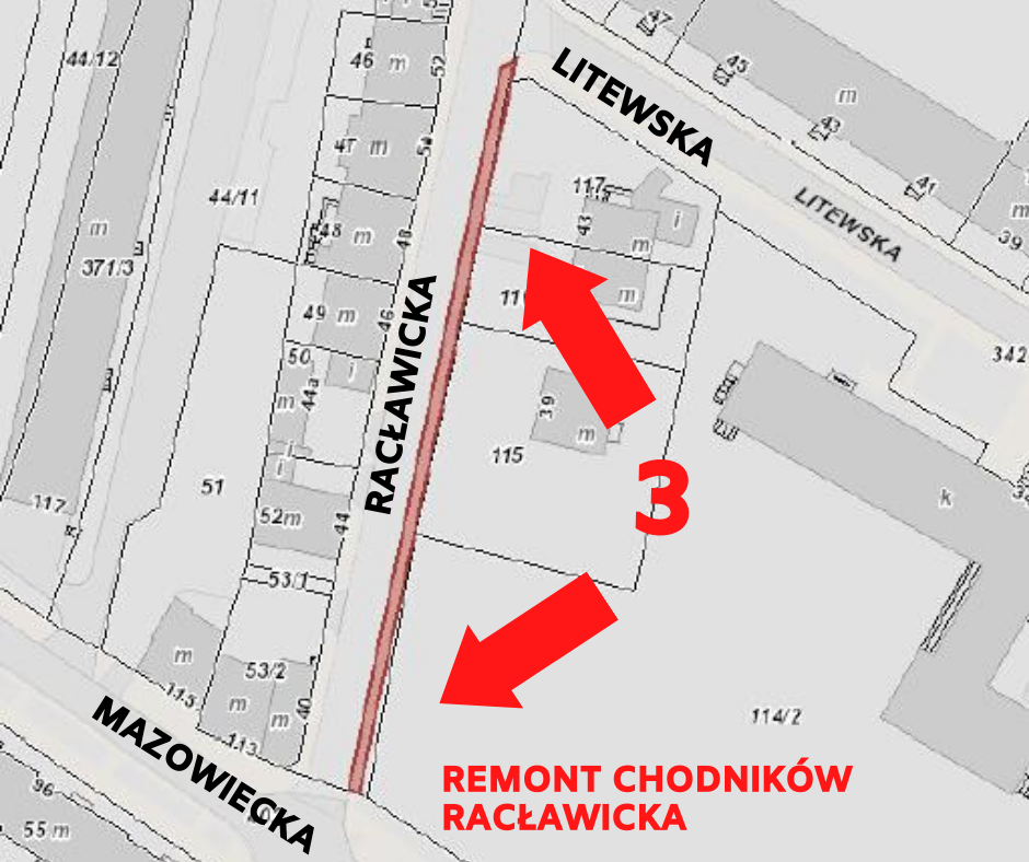 - remont chodnika przy ulicy Racławickiej (strona nieparzysta) – odcinek położony wzdłuż ulicy, od skrzyżowania z ulicą Litewską, do skrzyżowania z ulicą Mazowiecką - położenie nowej kostki niefazowanej (dostosowanie do potrzeb osób z niepełnosprawnościami, osób starszych i rodziców z wózkami). W przypadku przejścia dla pieszych montaż wypustek dla osób niewidzących lub słabowidzących na skrajni chodnika przed pasami oraz odpowiednimi spadami Nr 3 na dołączonych mapach.