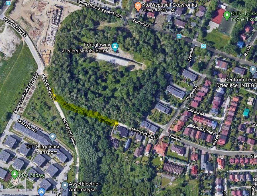 Niemniej jednak szerokość tej działki jest niewystarczająca na budowę ciągu pieszo rowerowego (a nawet samego ciągu pieszego - na niektórych odcinkach szerokość działki nie dochodzi do 2,5m) konieczne jest rozszerzenie inwestycji na działkę sąsiednią 118/1 obr 69 Podgórze, która stanowi teren Fortu Borek i podlega ochronie konserwatorskiej.