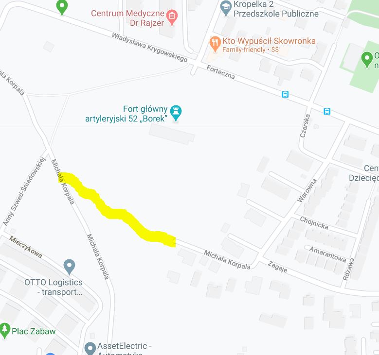 Ciąg pozwoli na skomunikowanie pieszo-rowerowe ulicą Korpala od skrzyżowania z ul. Anny Śniadowskiej do ul. Zagaje.i ul. Warownej