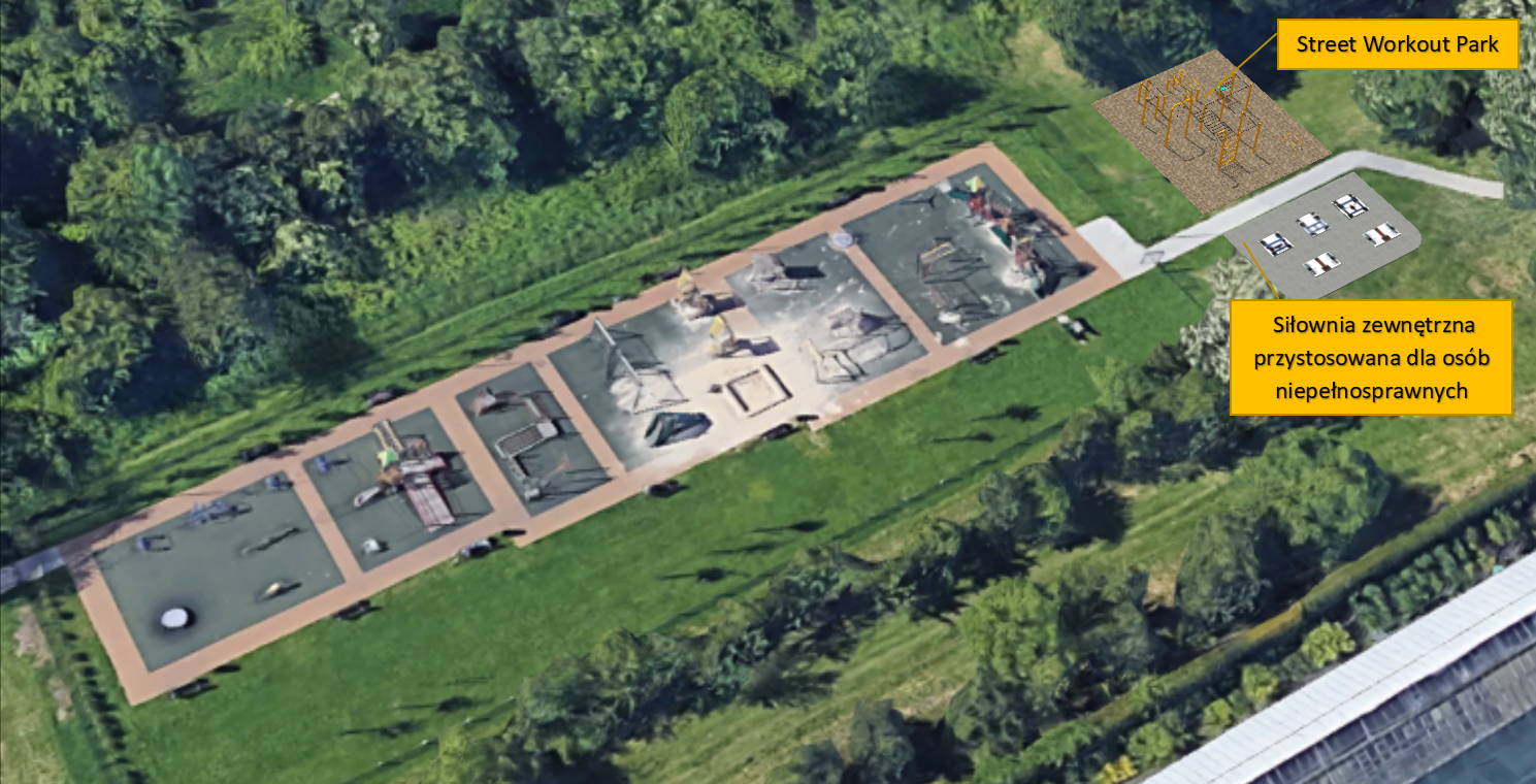 Drugim elementem modernizacji placu zabaw jest budowa street workout parku. W ostatnich latach widać wzrost zainteresowania kalisteniką czyli treningiem siłowym opartym na ćwiczeniach z wykorzystaniem własnej masy ciała. Ten rodzaj aktywności fizycznej jest szczególnie popularny wśród młodzieży i dorosłych, którzy często improwizują nie mając odpowiedniego zaplecza treningowego (wykorzystywanie urządzeń z placu zabaw, które nie są dostosowane do dużych obciążeń). Budowa parku treningowego w bezpośrednim sąsiedztwie placu zabaw ma na celu świadome aktywizowanie młodzieży, która wyrośnie z urządzeń zabawowych i przeniesienie ich zainteresowania na urządzenia treningowe. Pozwoli to na podtrzymanie aktywności fizycznej na świeżym powietrzu u młodych osób i poprawę zdrowia (choroby kręgosłupa, wady postawy itp.)
