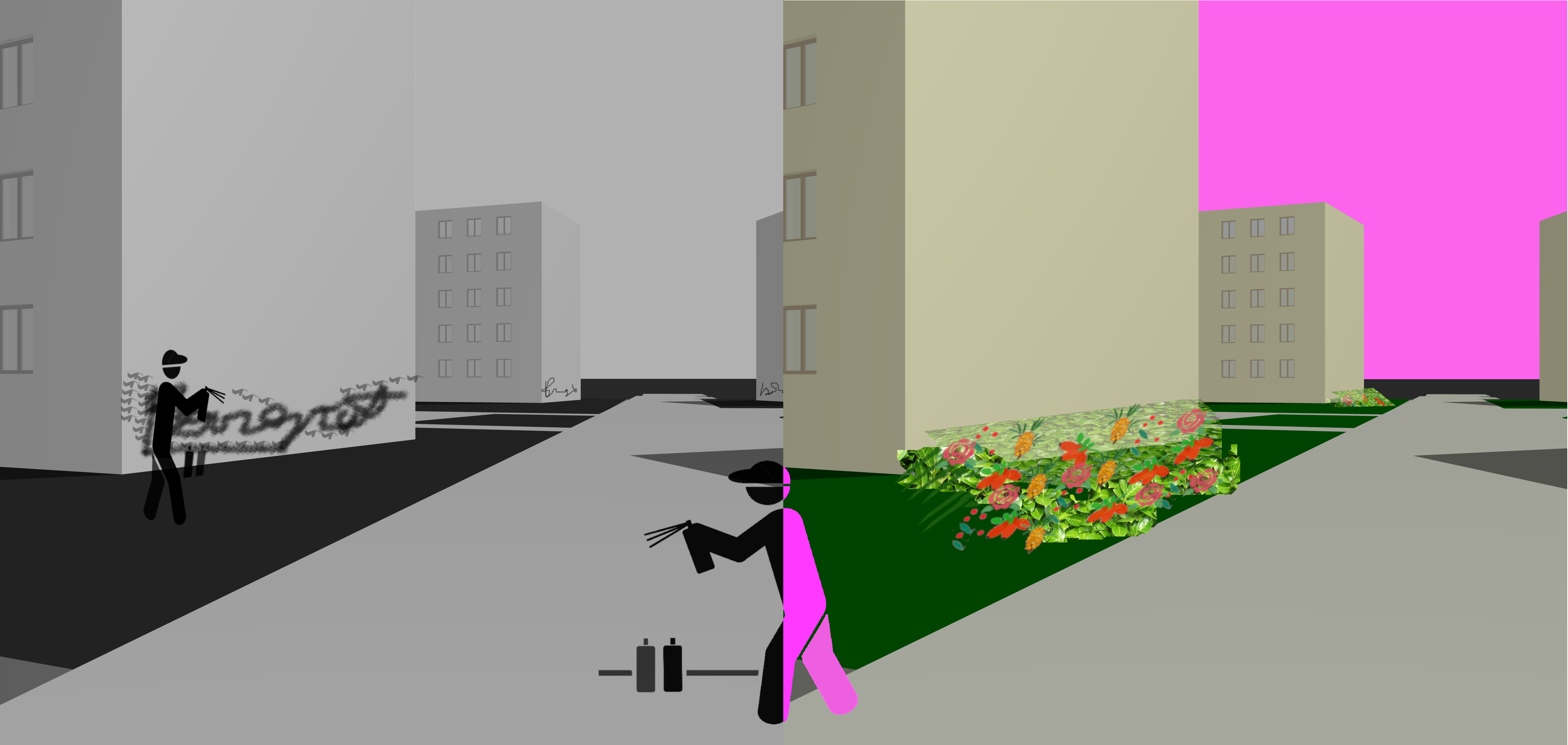 Projekt nasadzeń zlokalizowanych przed szczytowymi fasadami od alei Rusznikarska-deptak budynków Rusznikarska 16 oraz Krowoderskich Zuchów 23 tworzyłby przestrzeń buforową w znacznym stopniu utrudniając akty wandalizmu na elewacjach tych budynków. Nasadzenia przed elewacjami budynków, w bliskiej odległości od elewacji uniemożliwiałby łatwy dostęp do ścian budynków, a tym samym utrudniałby czas wykonania nielegalnego graffiti. Aby tak się stało nasadzenia powinny być gęste, z dużych roślin o wysokości od pasa w górę. Rośliny, które najlepiej sprawdziłby się do takiego zadania ze względu na swoją wytrzymałość, jak również posiadanie kolców to: róża dzika i pomarszczona, głogi, rokitnik, pigwowiec, niektóre irgi, berberys. Kompozycja kwiatowa i kształt linii frontowej nasadzenia powinien być skonsultowany z mieszkańcami, w celu rozwoju percypowania mieszkańców w podejmowaniu decyzji, uczeniu odpowiedzialności za przestrzeń, która ich otacza oraz rozwoju społeczeństwa obywatelskiego. Ważne jest, żeby pas nasadzeń był szeroki.