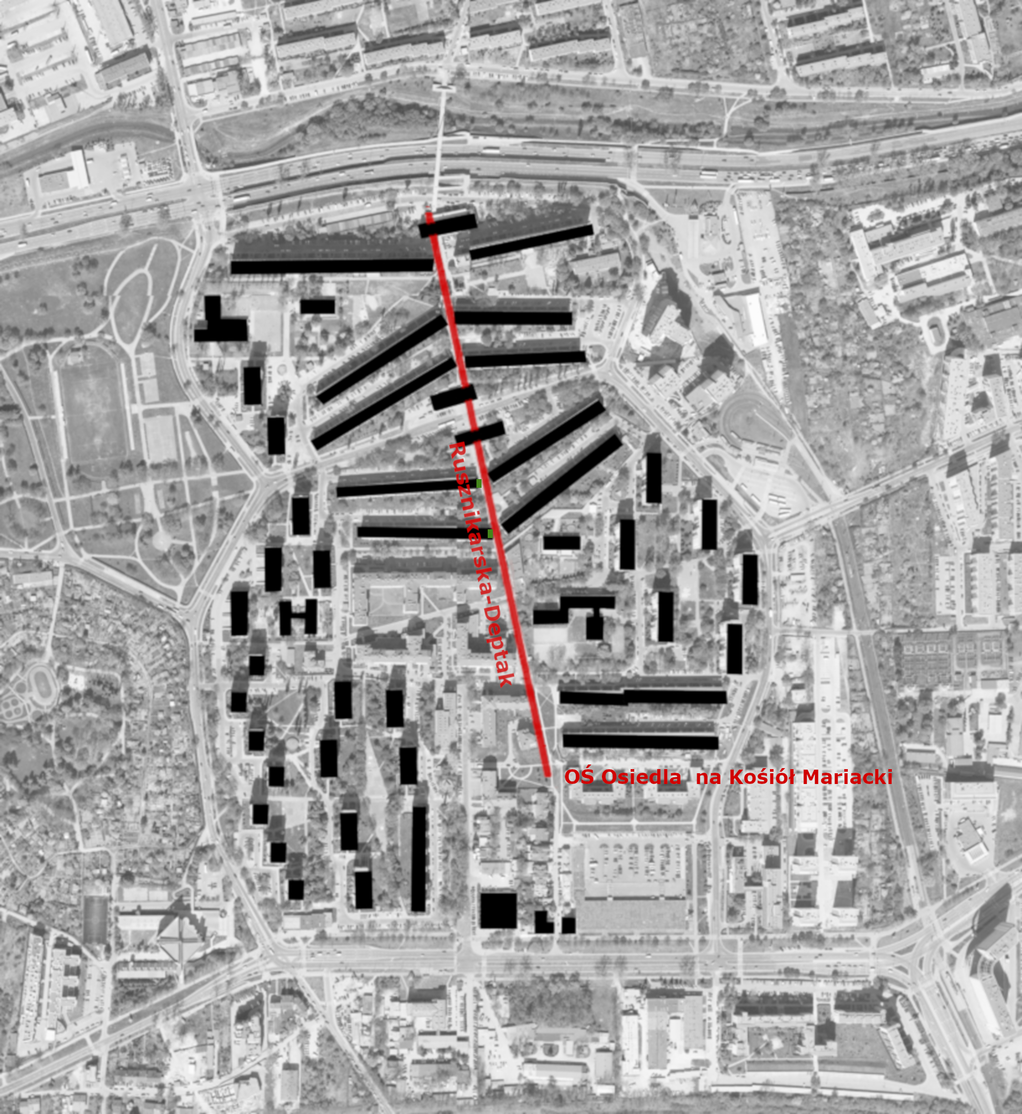 Osiedle Krowodrza Górka, którego cała koncepcja urbanistyczna została zaprojektowana pod koniec lat 70 przez Mieczysława Turskiego jest założeniem, w którym centralna oś (patrz grafika) dzisiejsza Rusznikarska-Deptak, jest skierowana w kierunku południowym wprost na Kościół Mariacki. Niestety, dzisiaj na ścianach budynków, wśród tej osi, szpecą BAZGROŁY.
