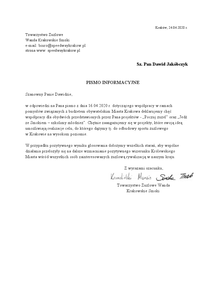 Kibice z Krakowa zasługują na żużel na najwyższym poziomie. Ten sport wpisuje się w sportową mapę stolicy Małopolski od lat 30. XX wieku. To dyscyplina z pięknymi tradycjami. Jej reaktywowanie pod Wawelem w połączeniu z udostępnieniem bezpłatnych biletów pozytywnie wpłynie na rozwój więzi społecznych. To szansa na spędzenie czasu z rodziną i znajomymi w pozytywnej atmosferze sprzyjającej pogłębianiu pasji i zainteresowań. Żużel jest dyscypliną, która łączy pokolenia. Na stadionach w całej Polsce spotykają się dzieci, dorośli i seniorzy. Wszyscy dopingując swoją drużynę oglądają rywalizacje w duchu fair play. To szczególnie dobra lekcja dla najmłodszych. Przedstawiony projekt pozwoli dać Miastu kolejne miejsce będące przyjazną formą spędzania wolnego czasu zarówno dla rodzin jak i grup przyjaciół.